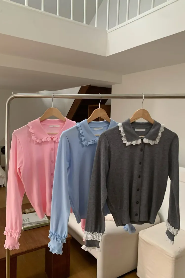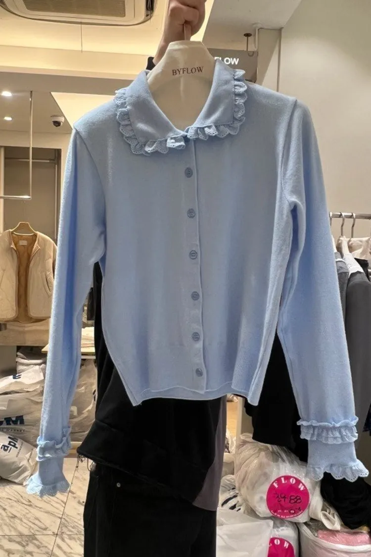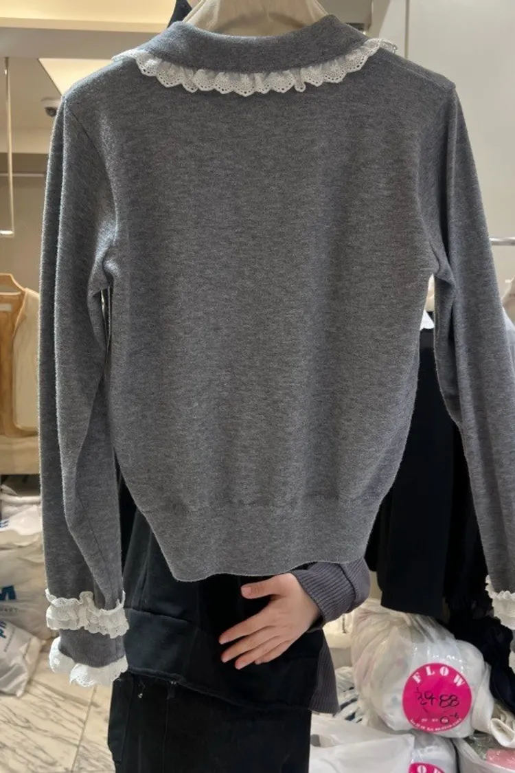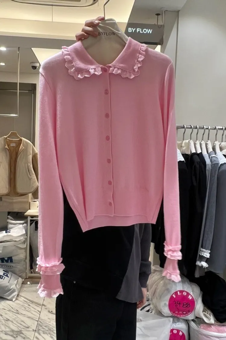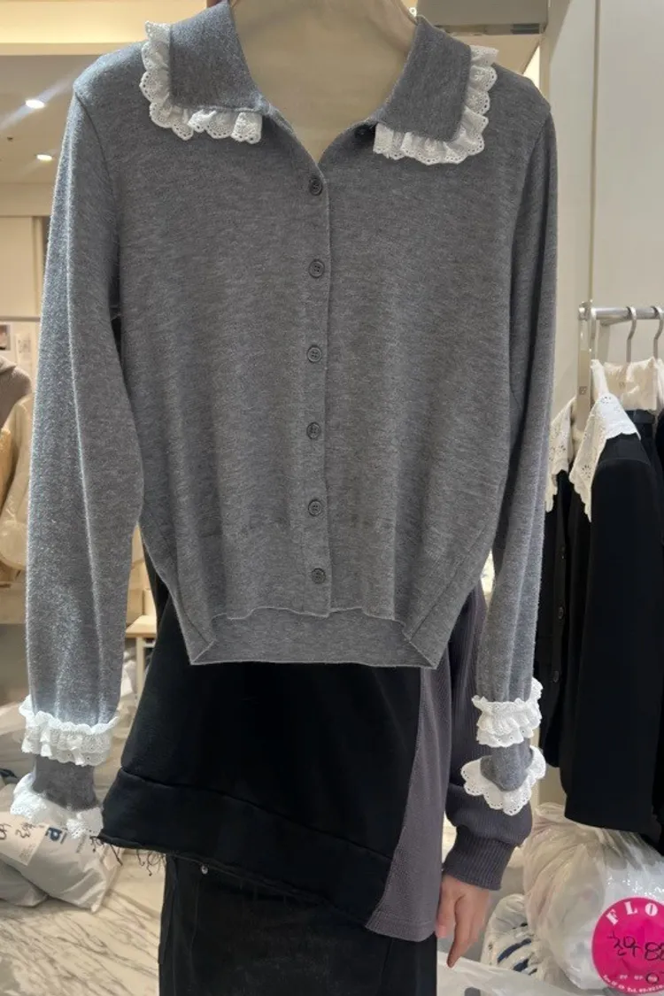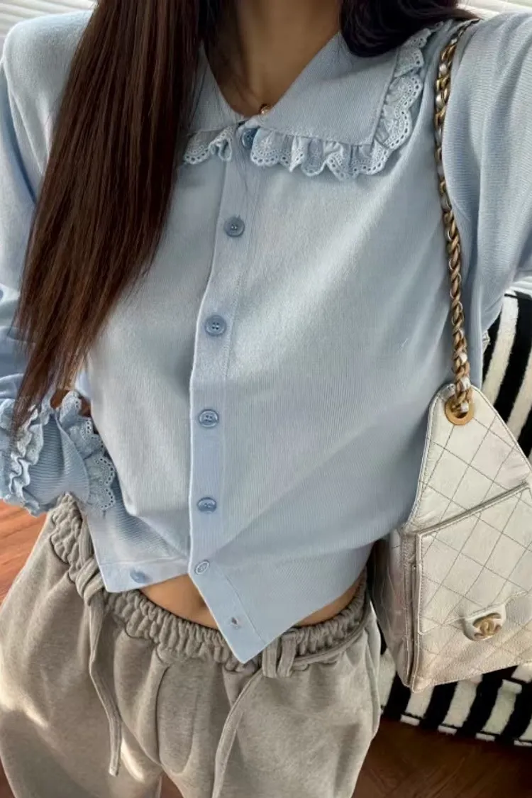 法式浪漫蕾絲領滾邊縮口袖針織開襟衫