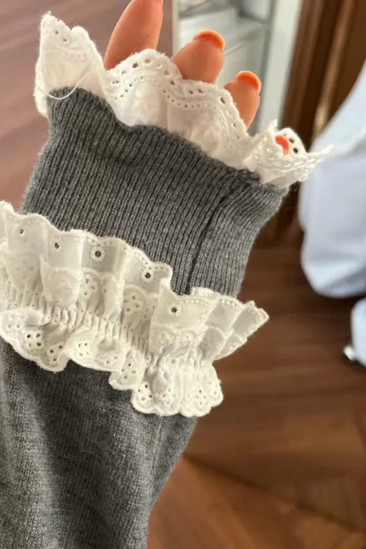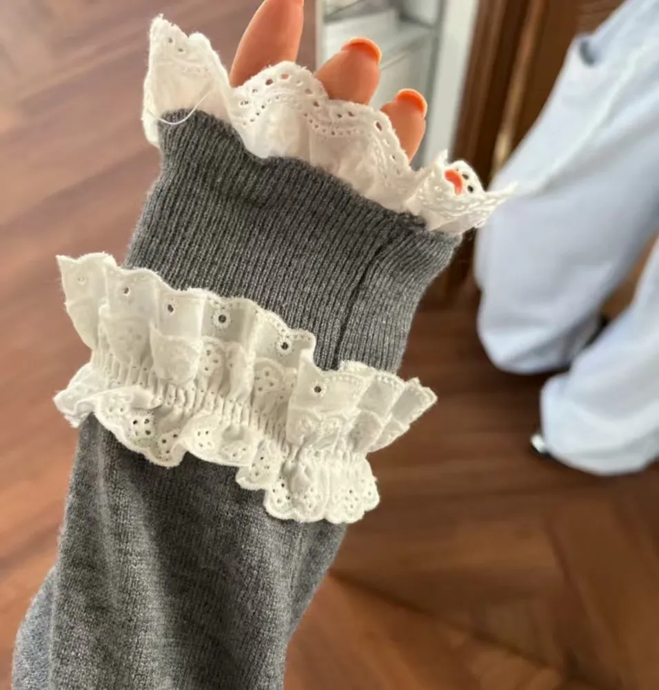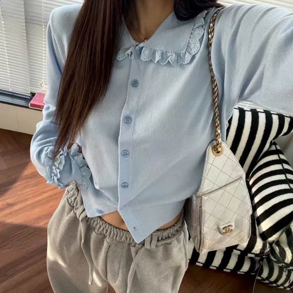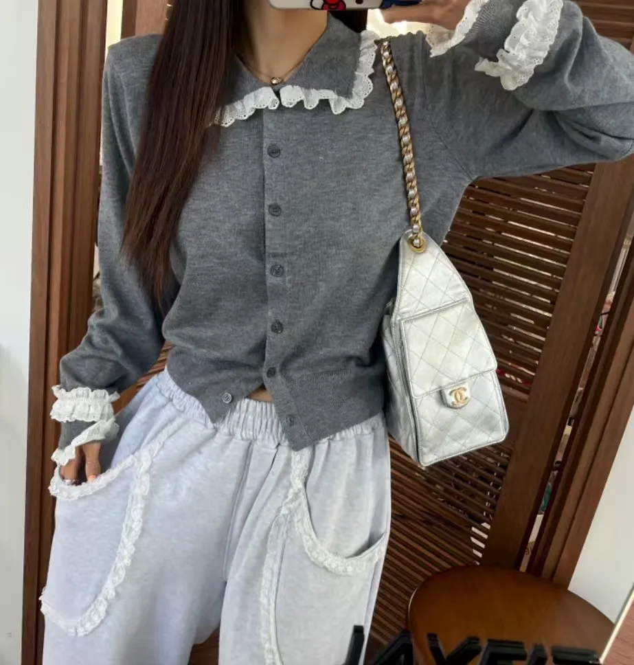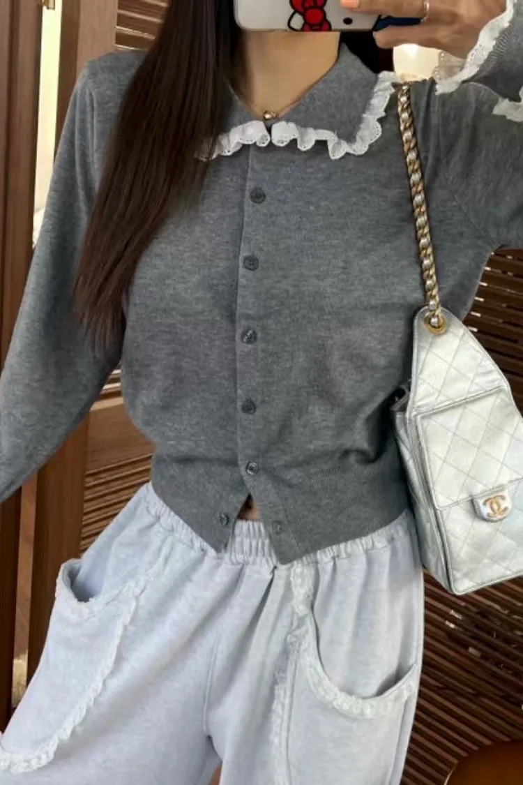 法式浪漫蕾絲領滾邊縮口袖針織開襟衫