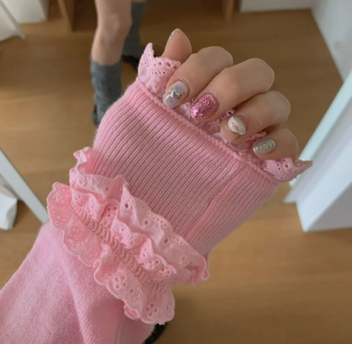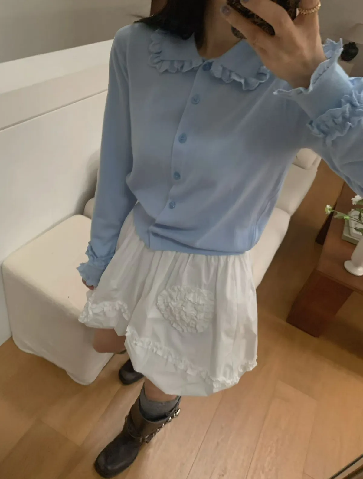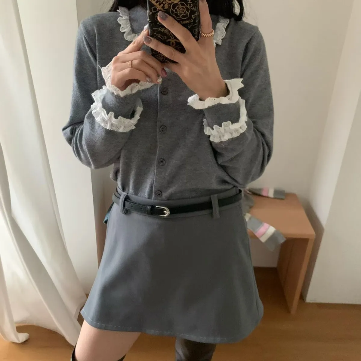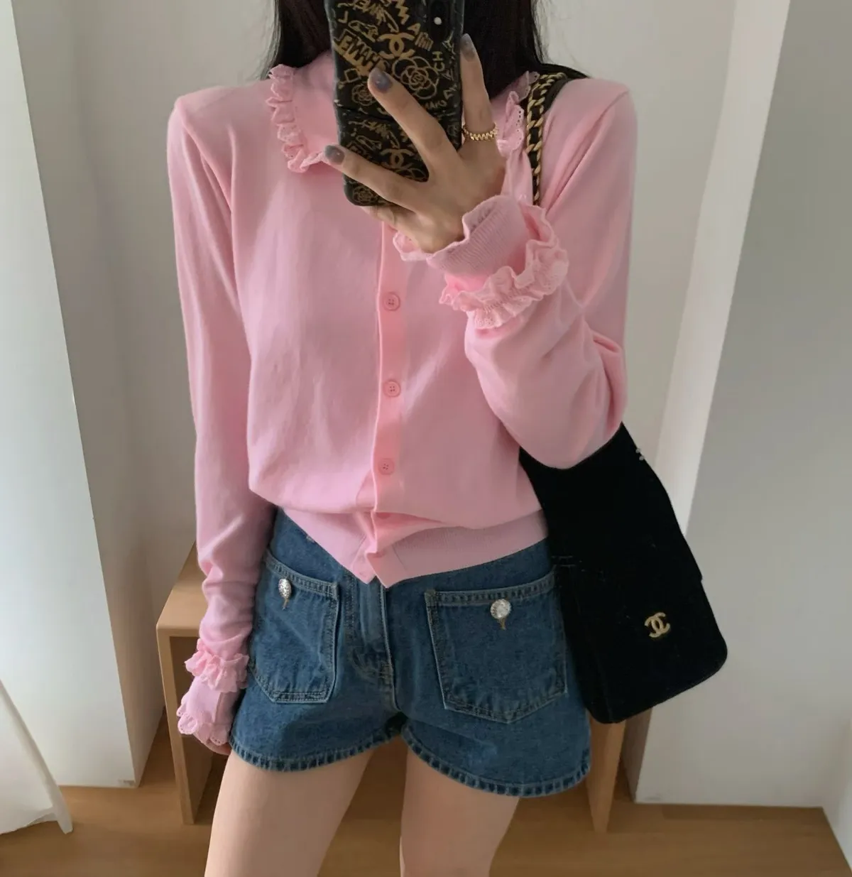 法式浪漫蕾絲領滾邊縮口袖針織開襟衫