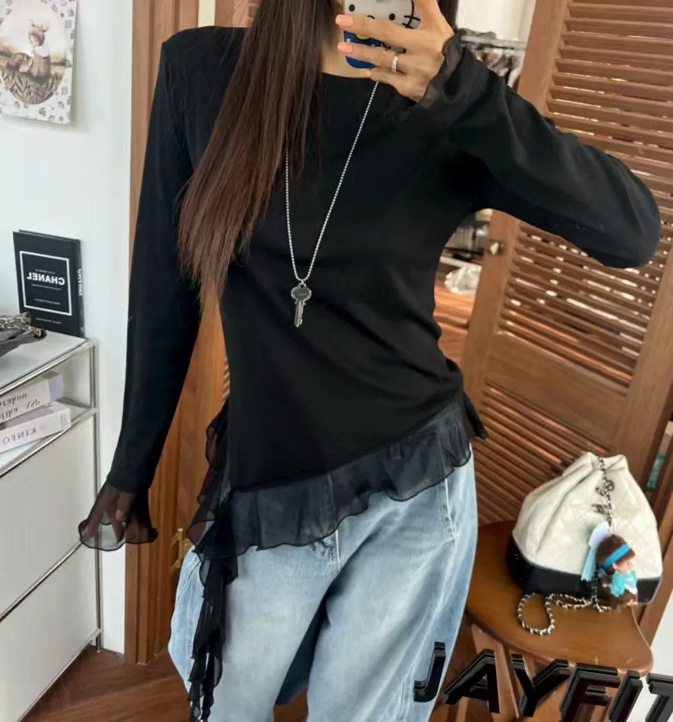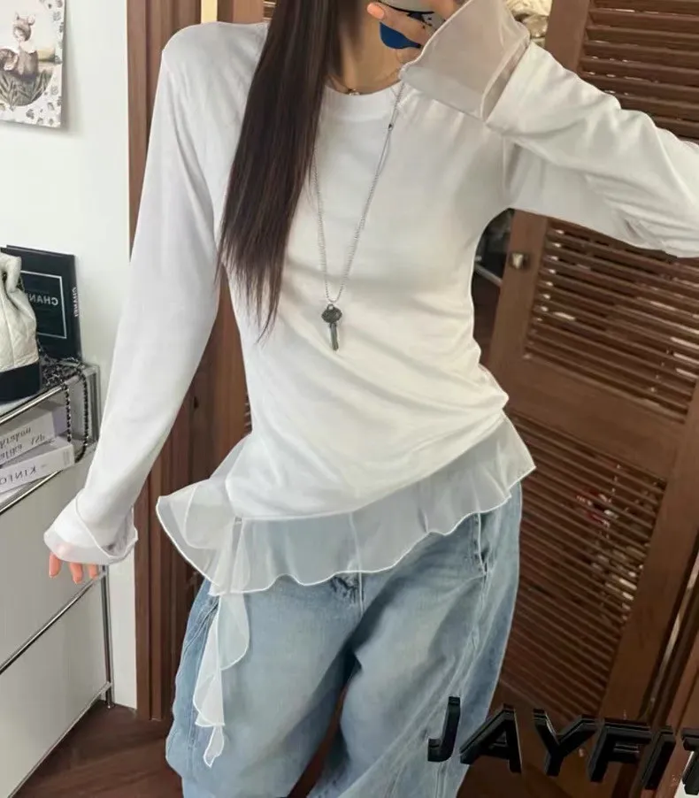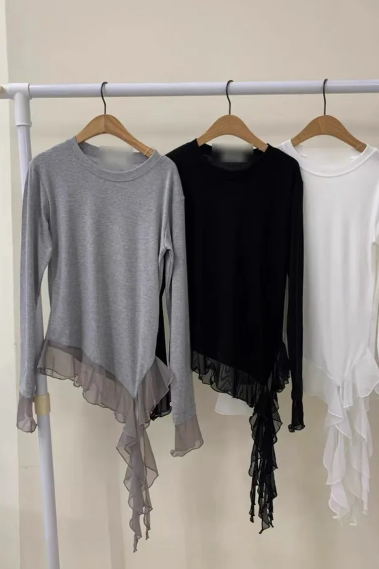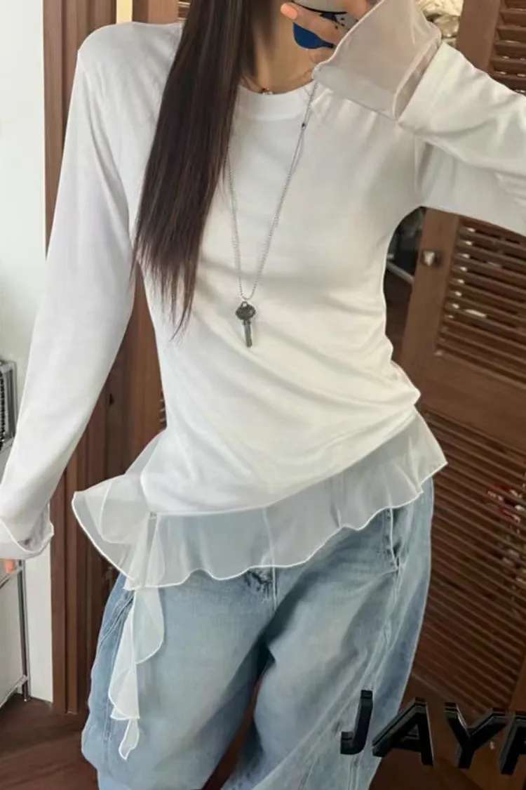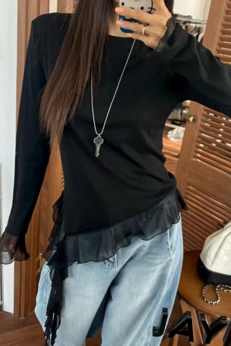 不規則拼接透紗下襬修身長袖上衣