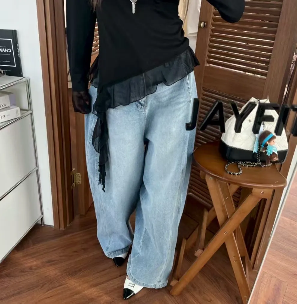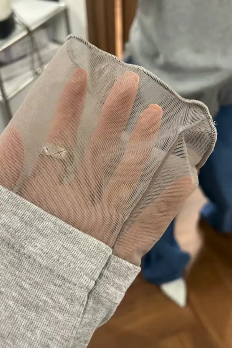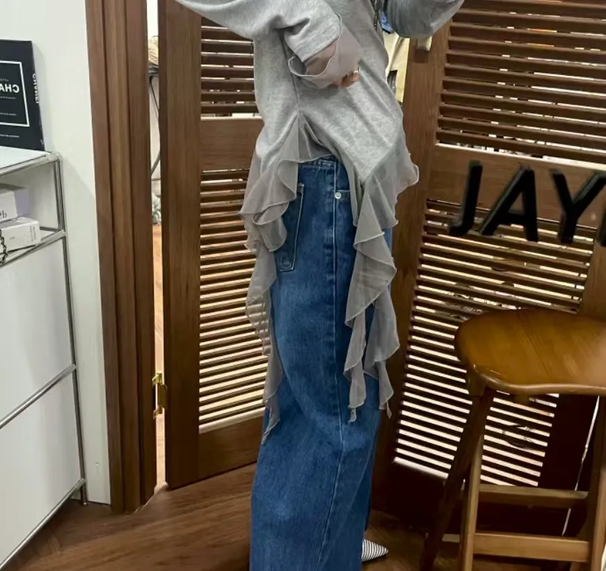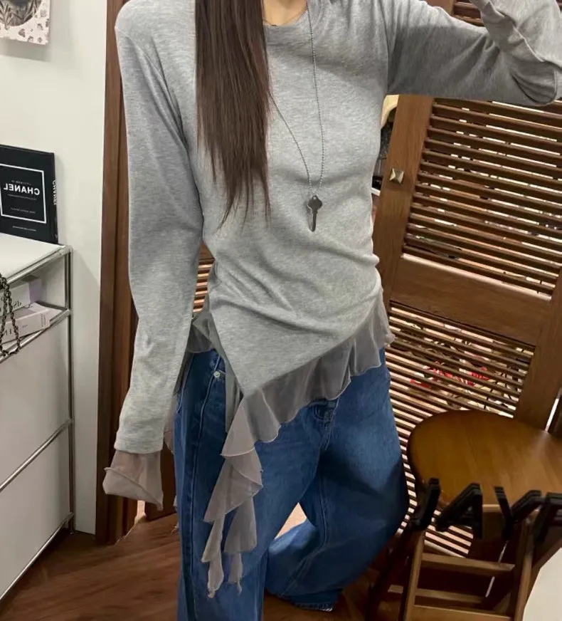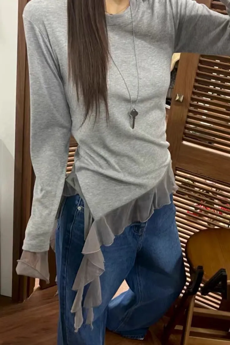 不規則拼接透紗下襬修身長袖上衣