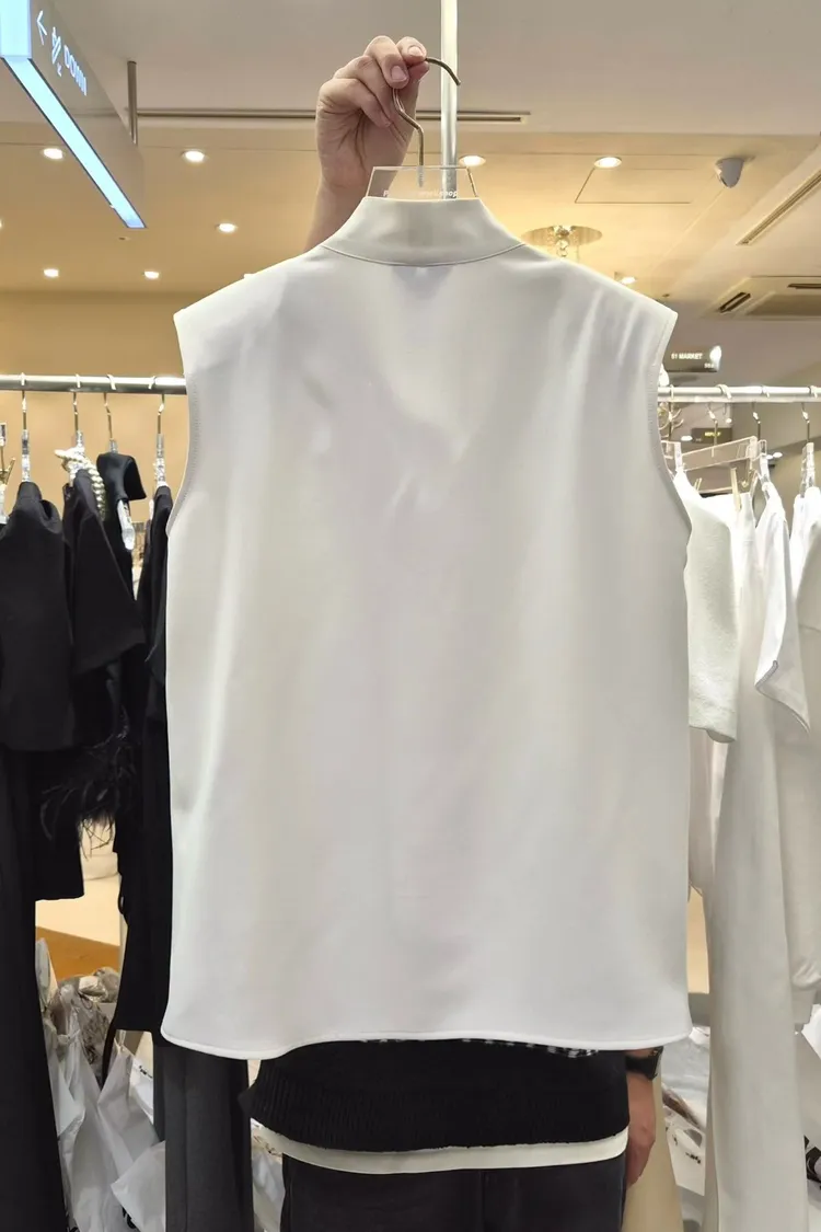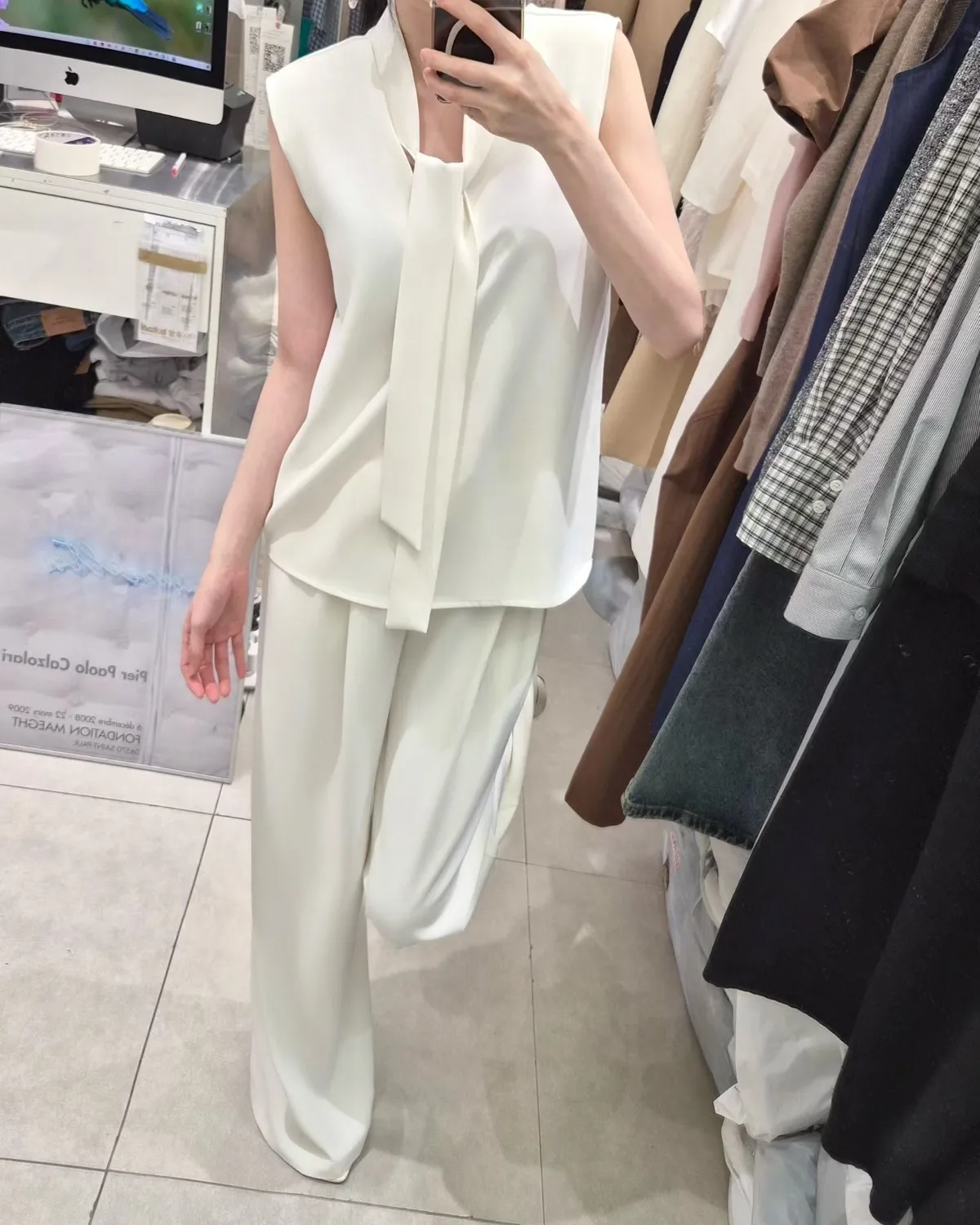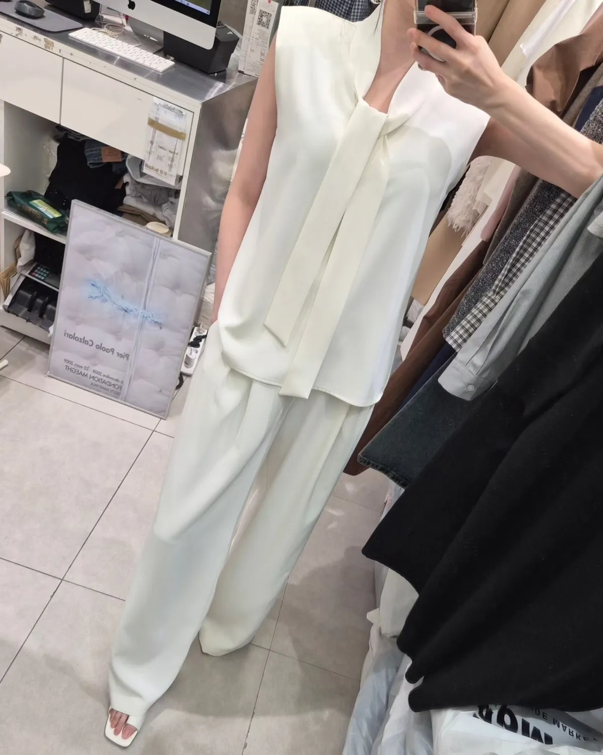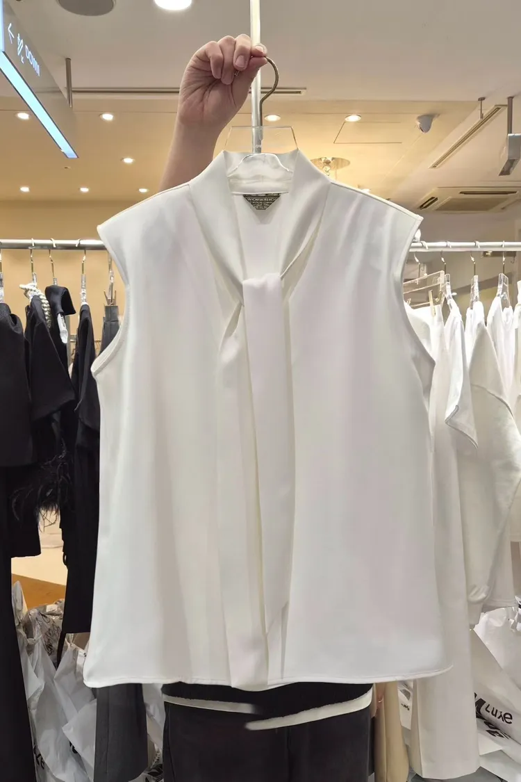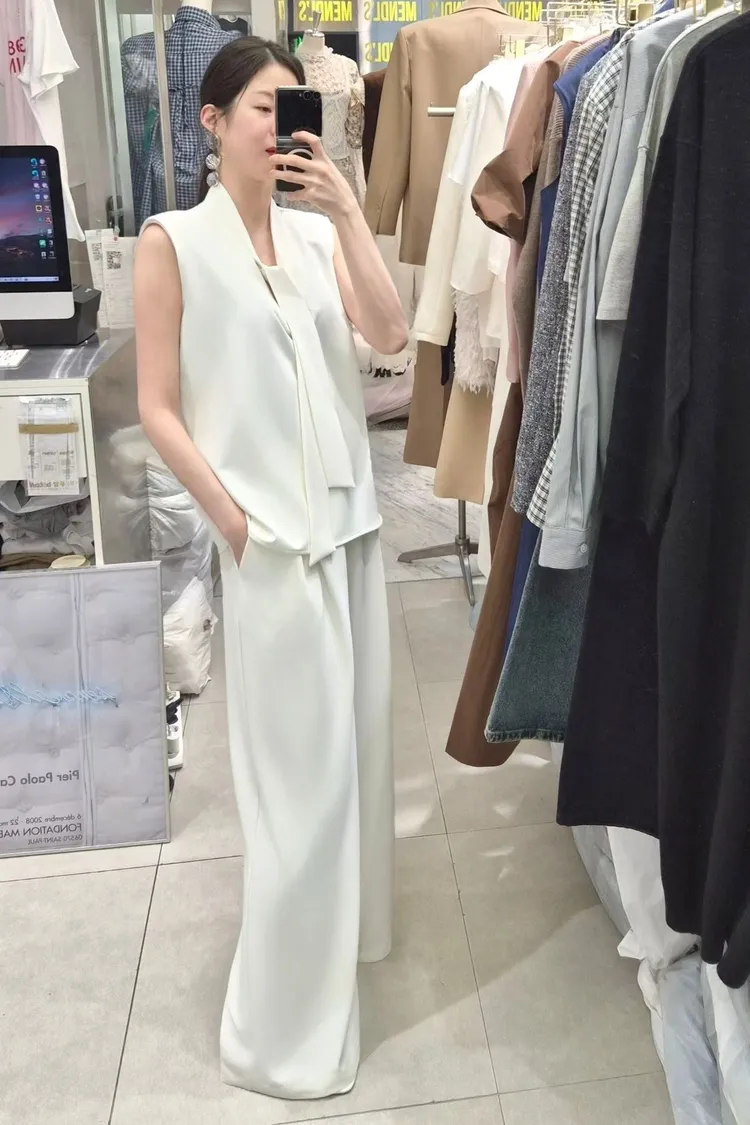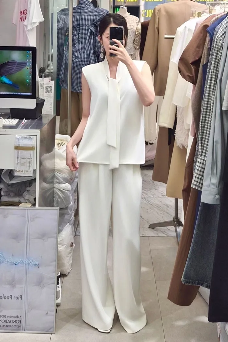 披肩領造型無袖上衣+高腰寬褲套裝