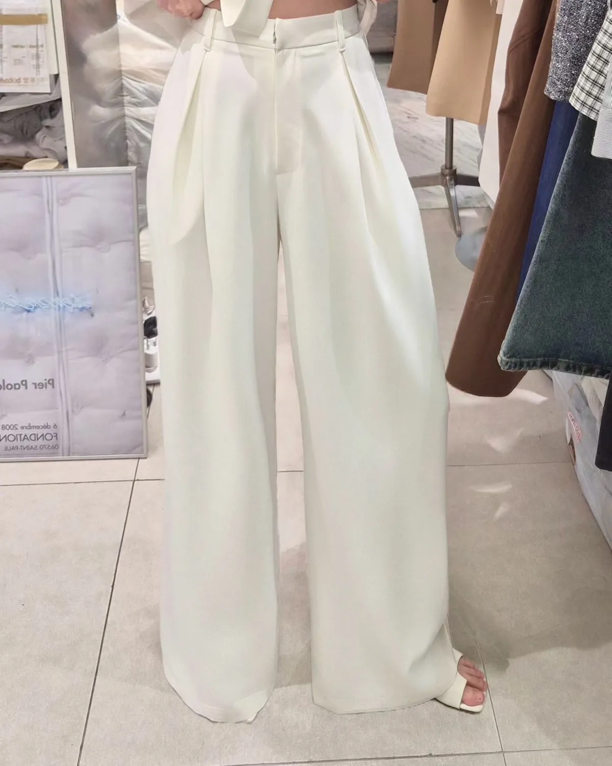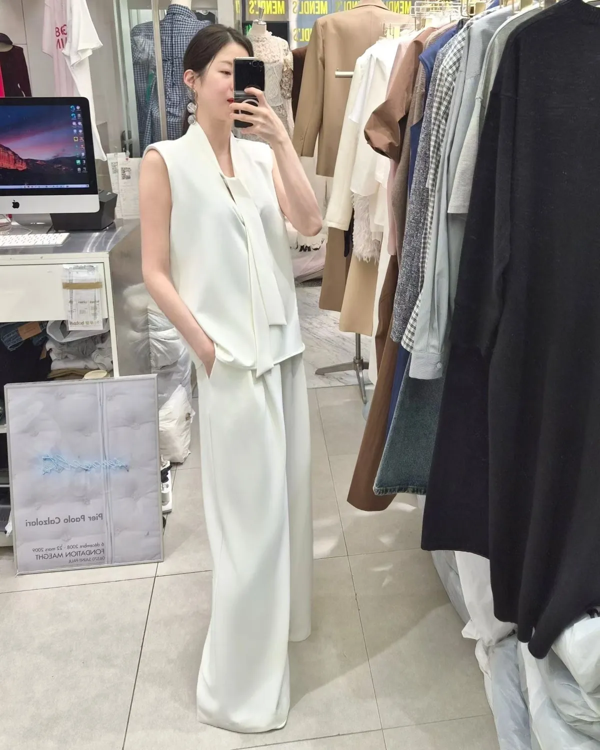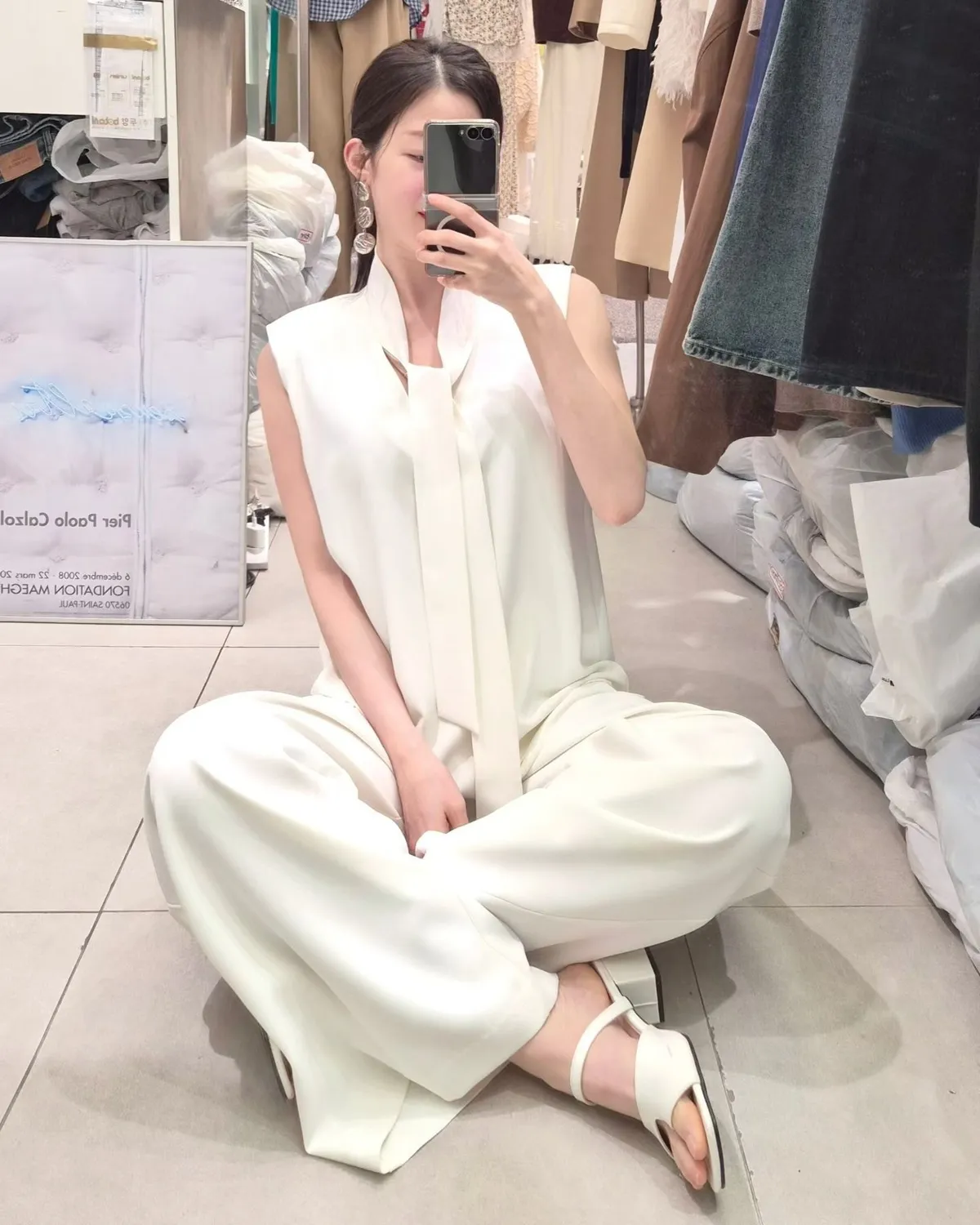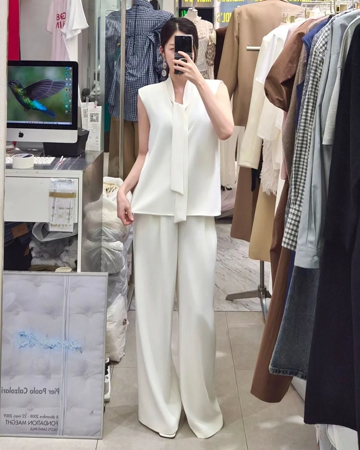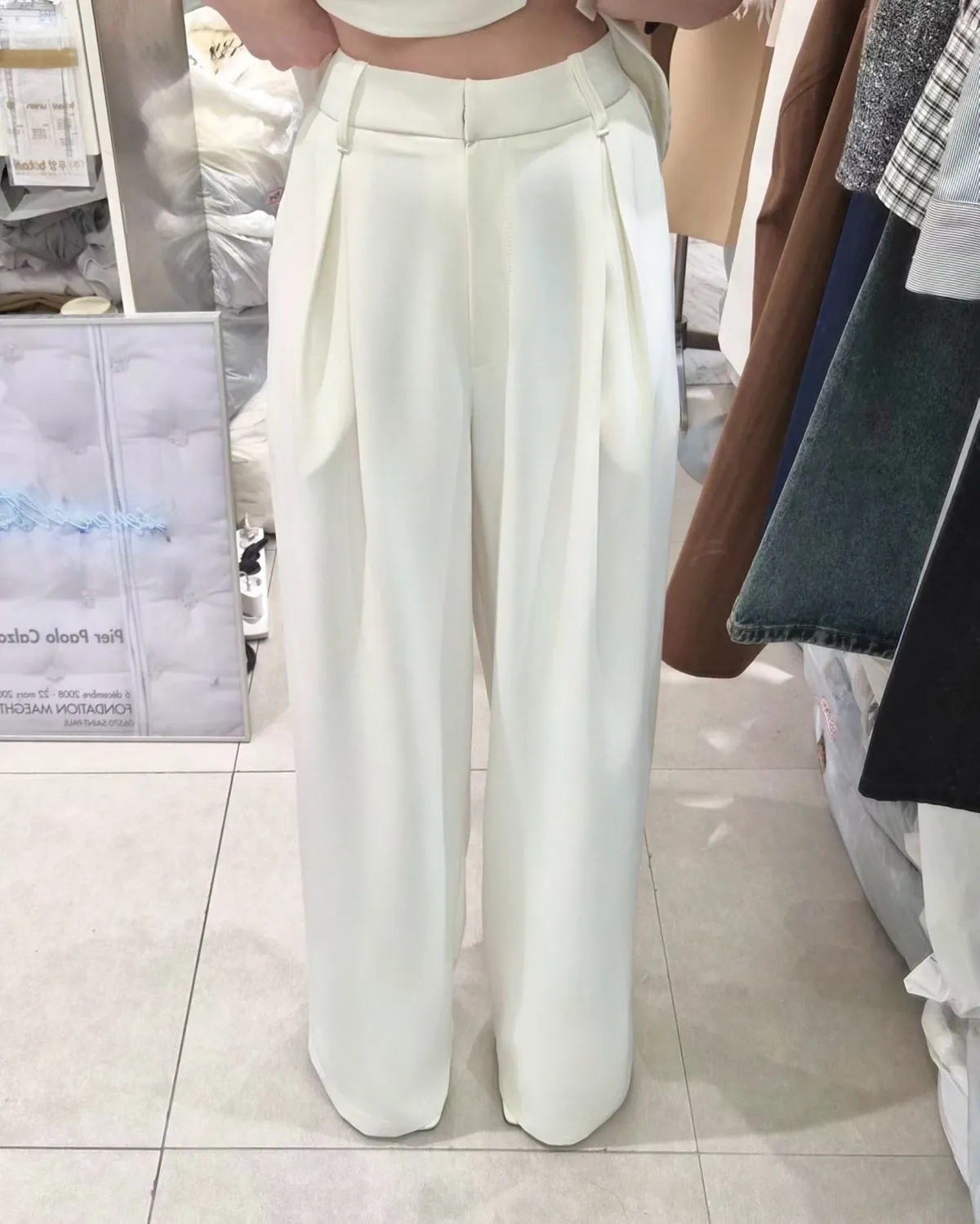披肩領造型無袖上衣+高腰寬褲套裝
