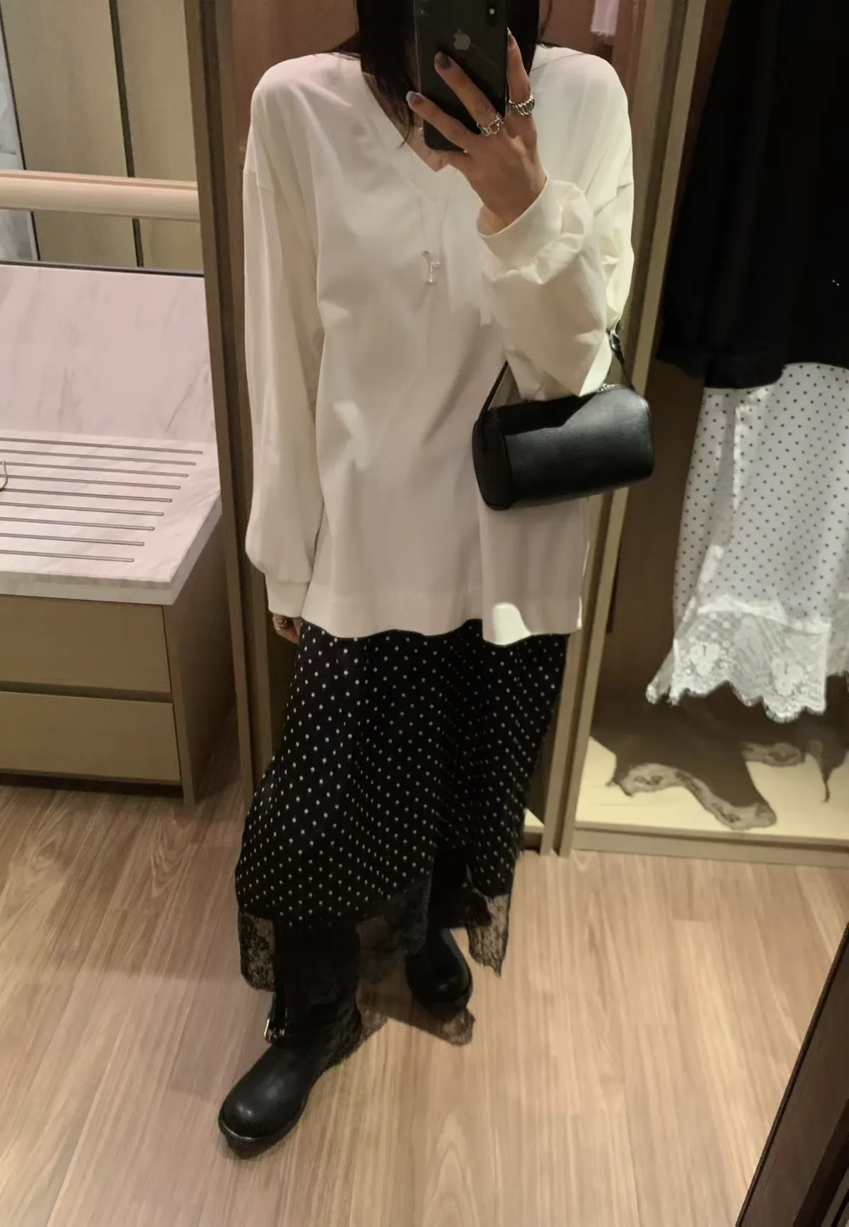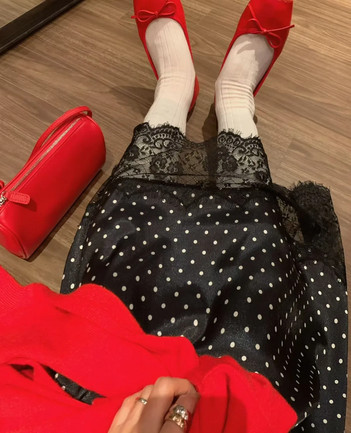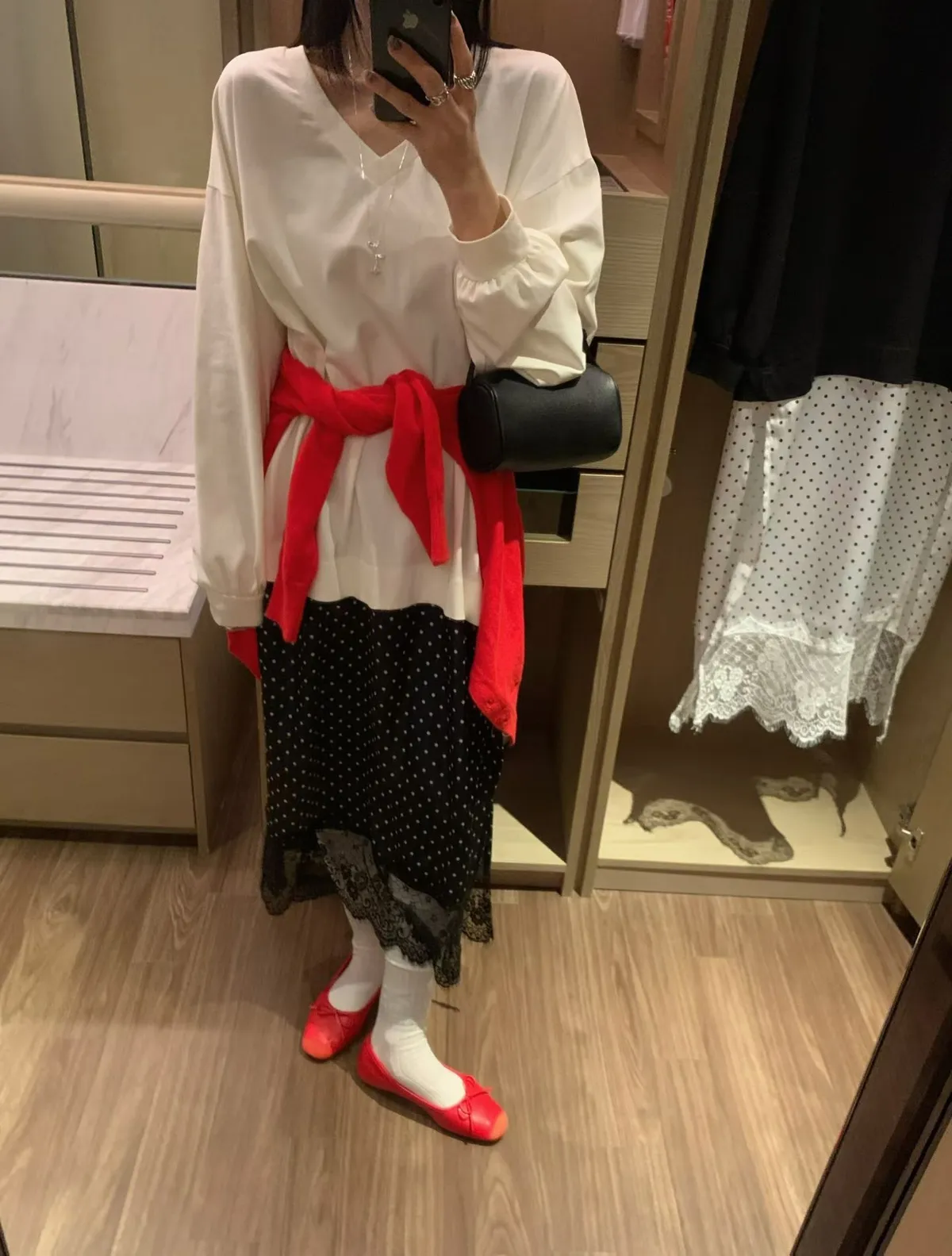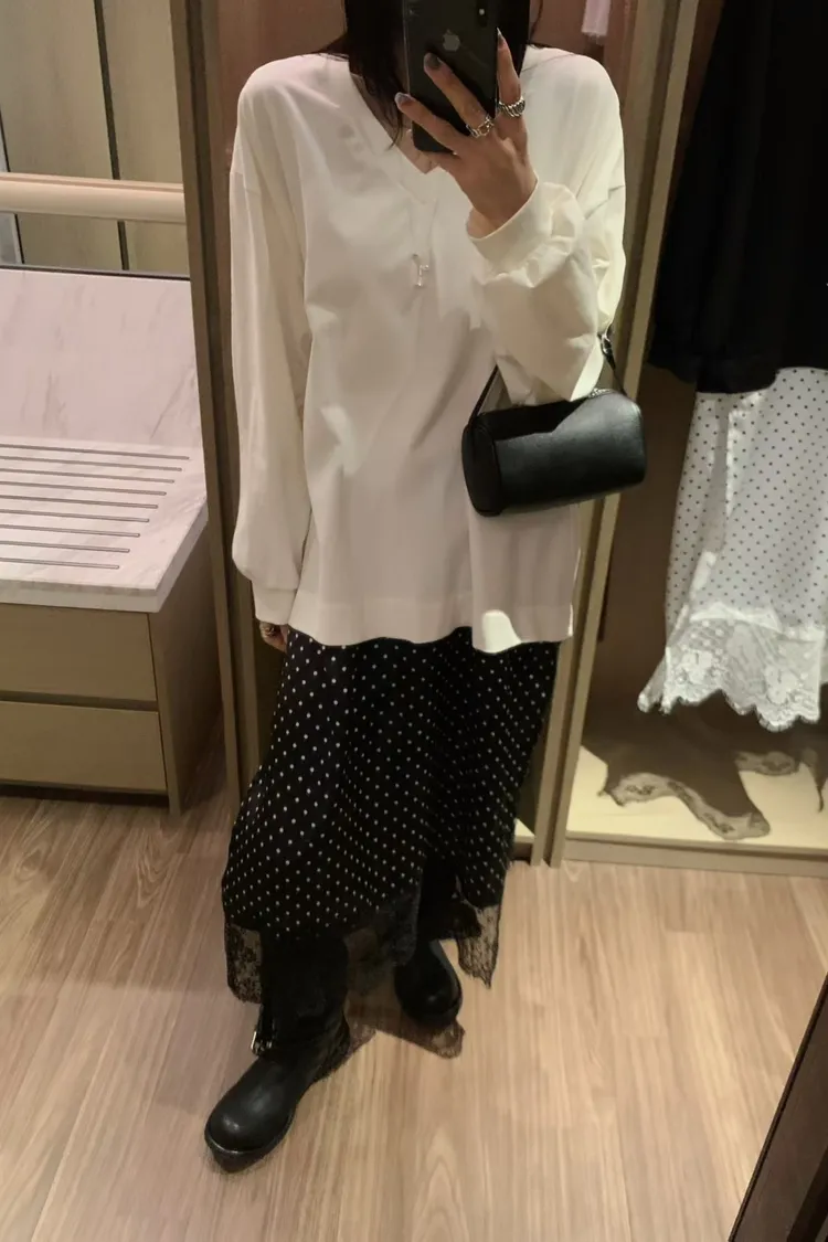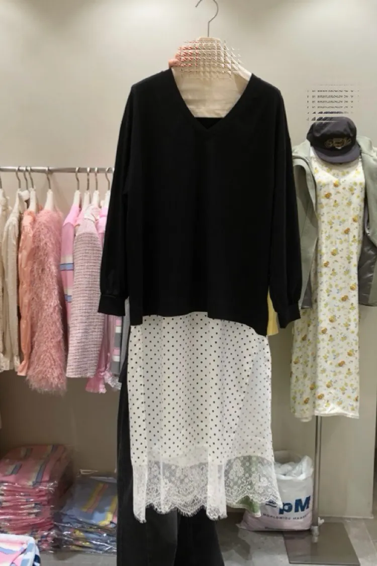 V領拼接下擺圓點蕾絲連身裙