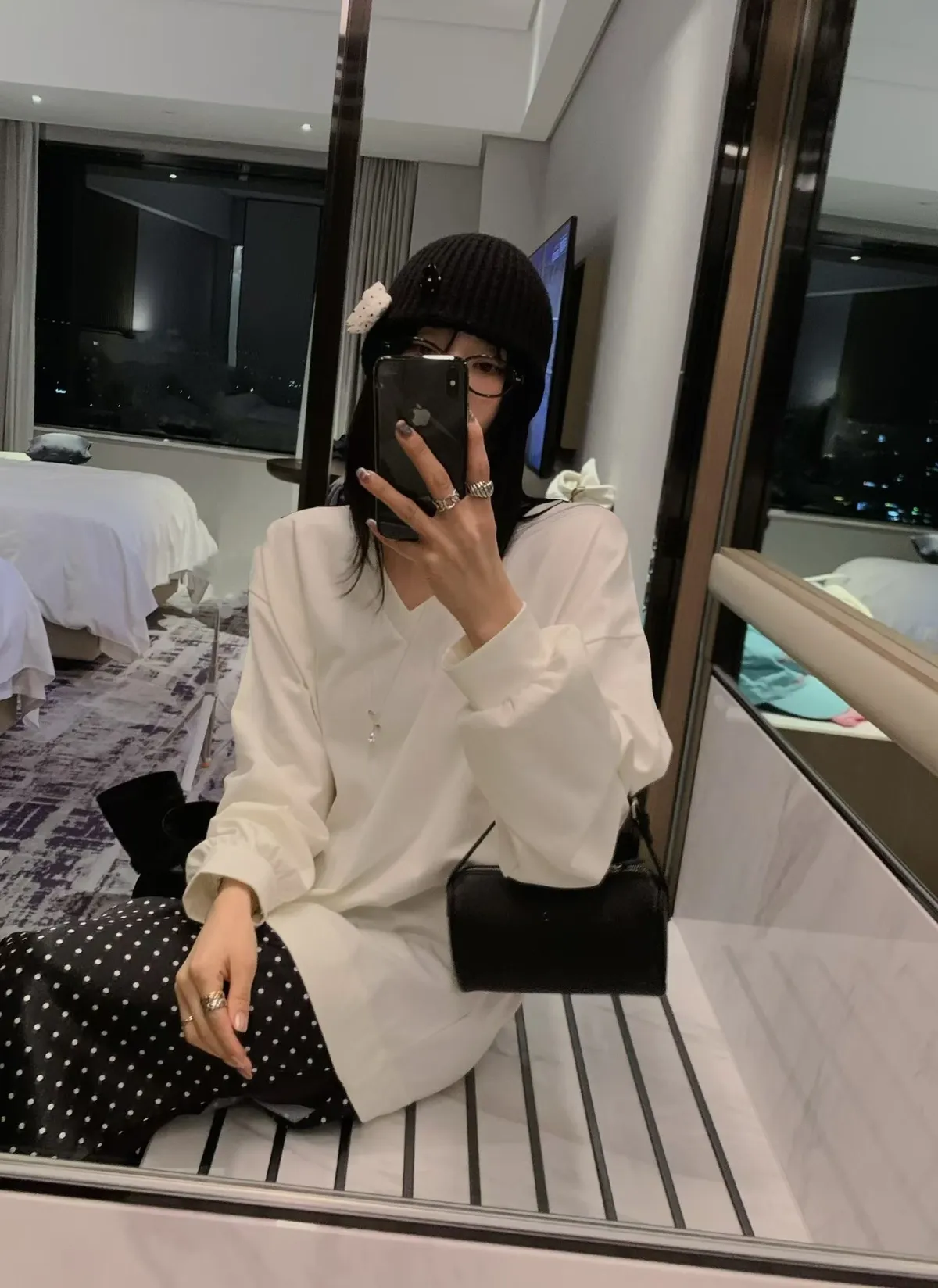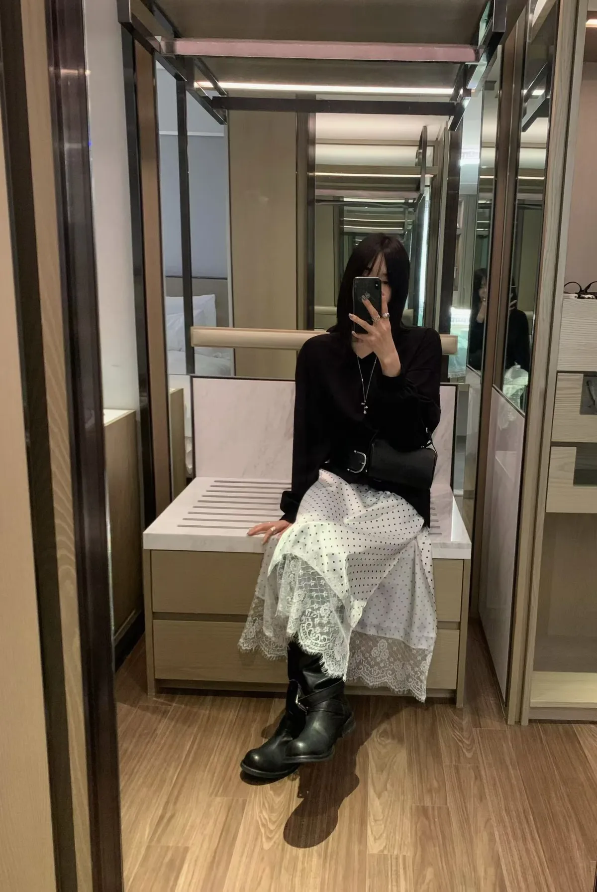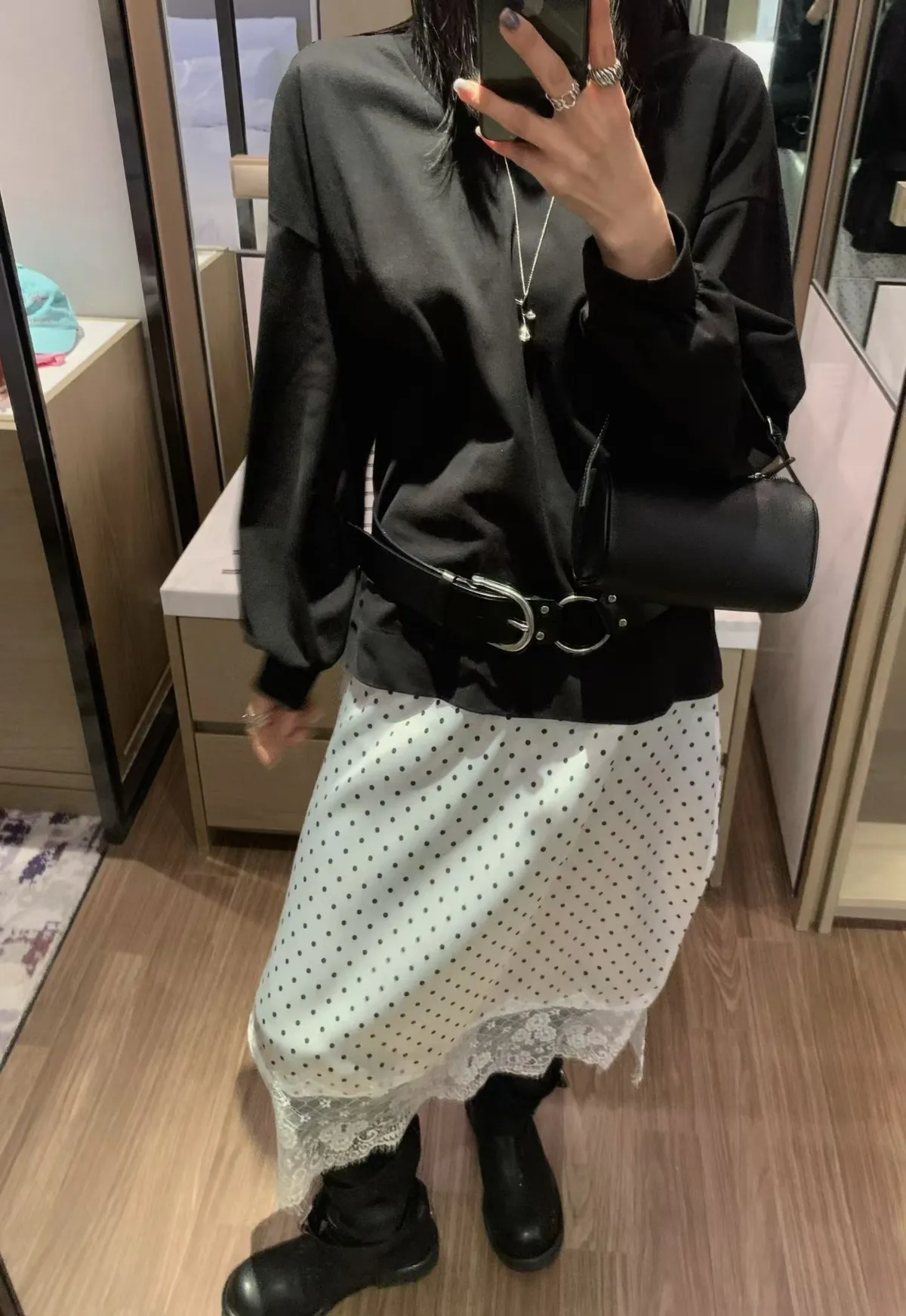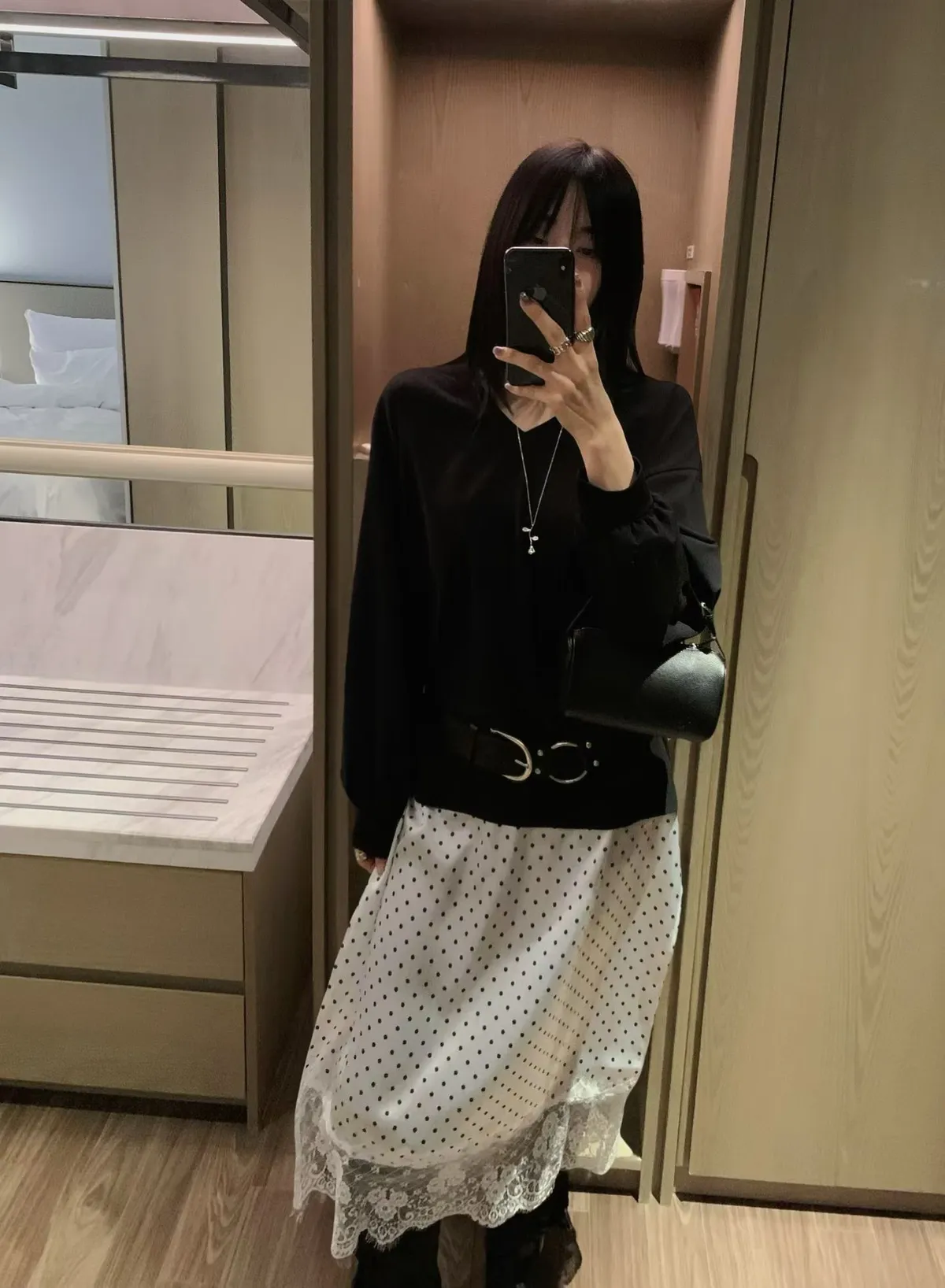 V領拼接下擺圓點蕾絲連身裙