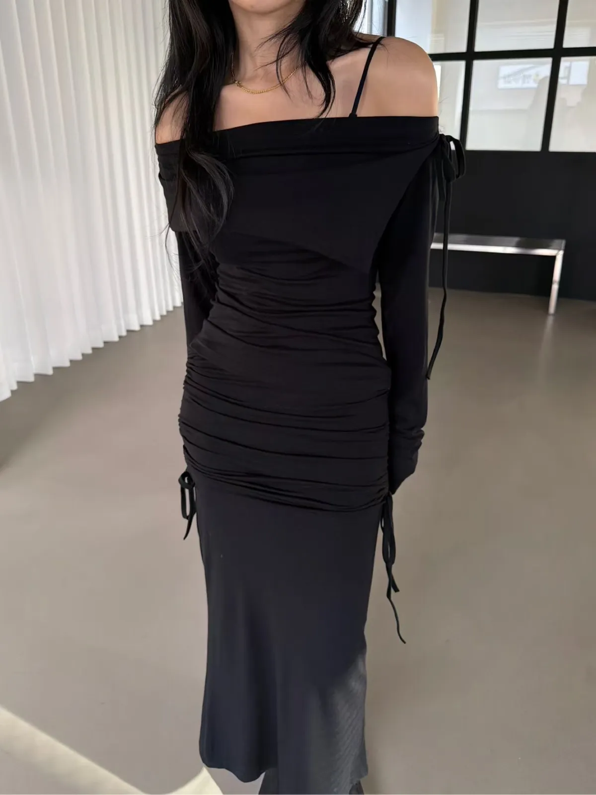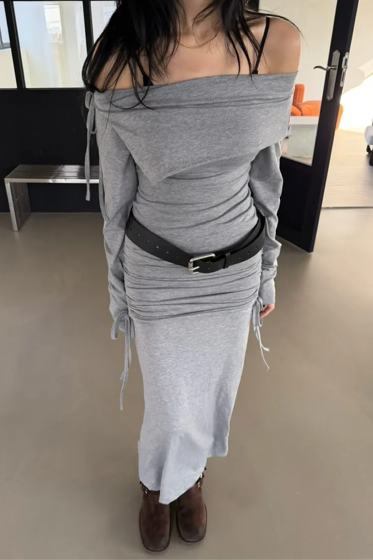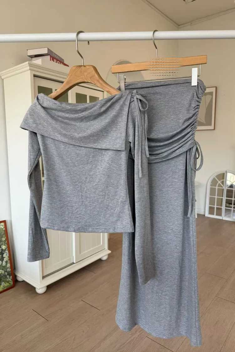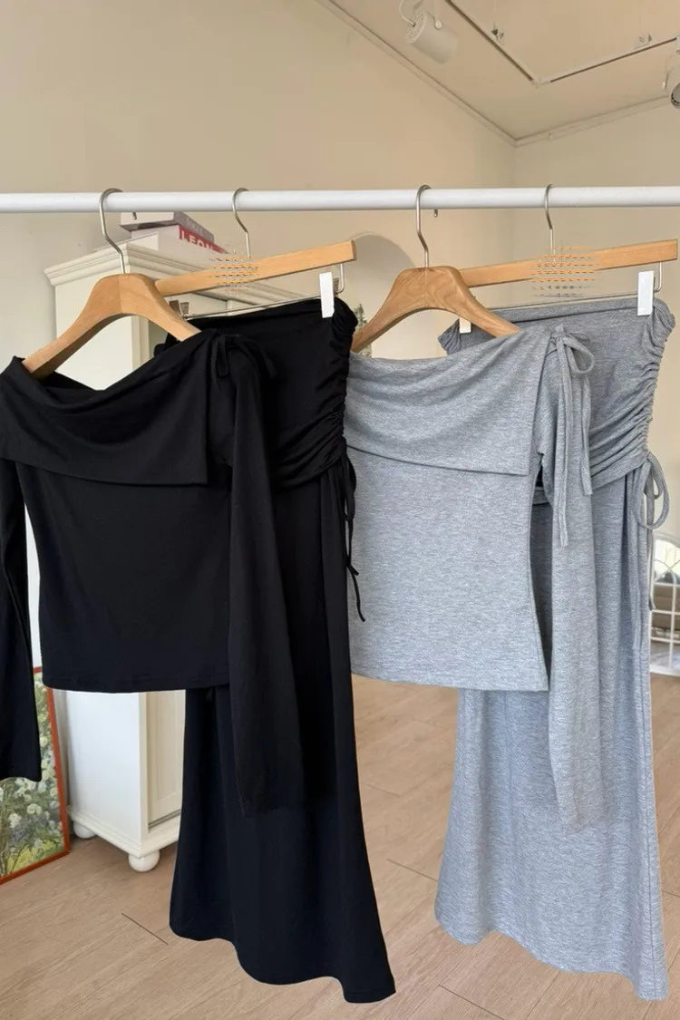 一字領翻領上衣+側抽繩抓皺長裙 套裝