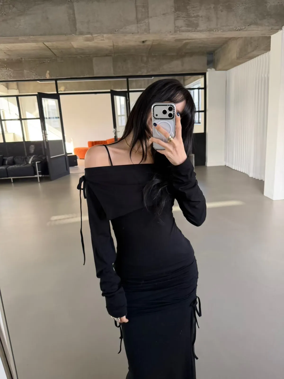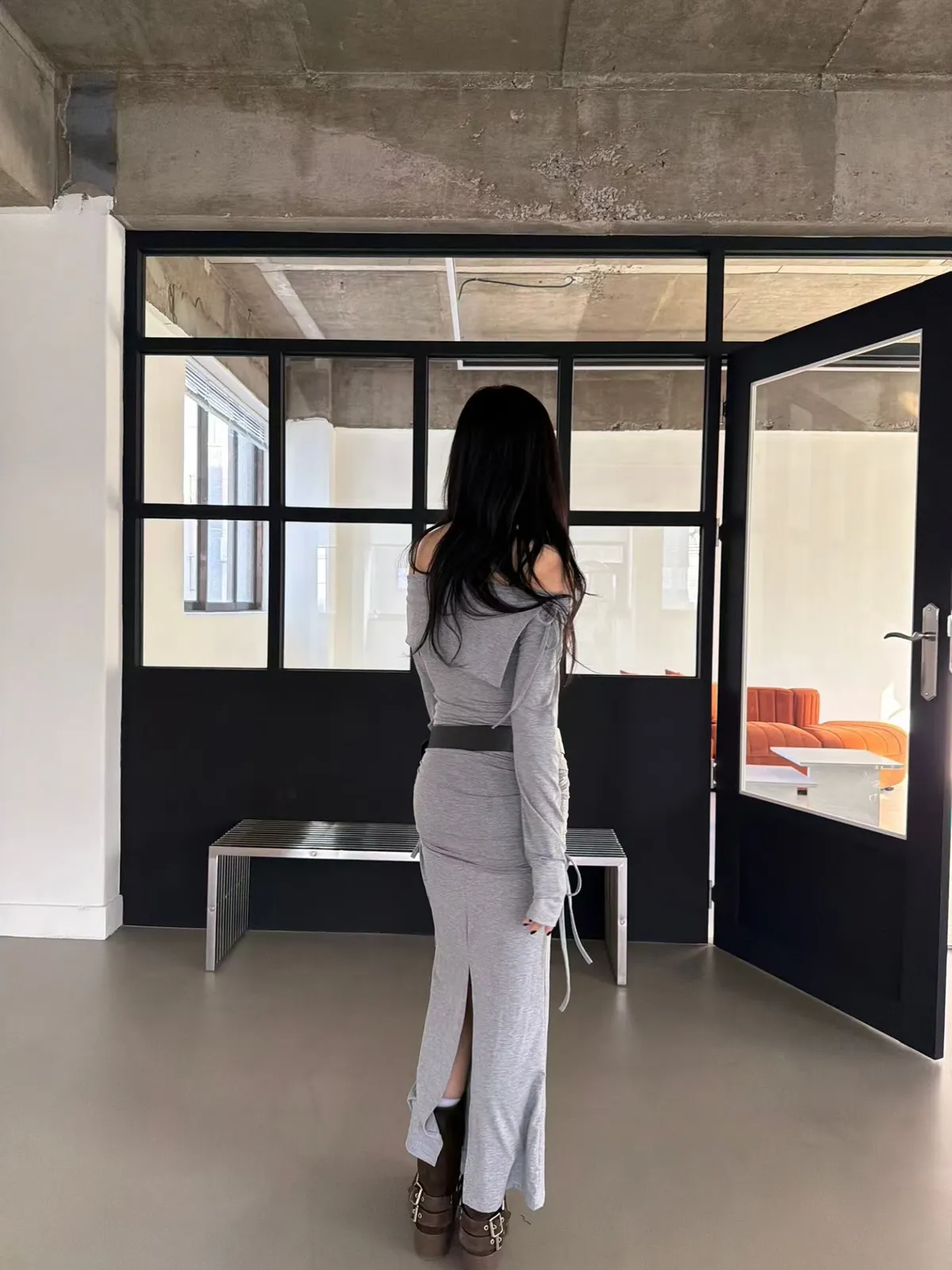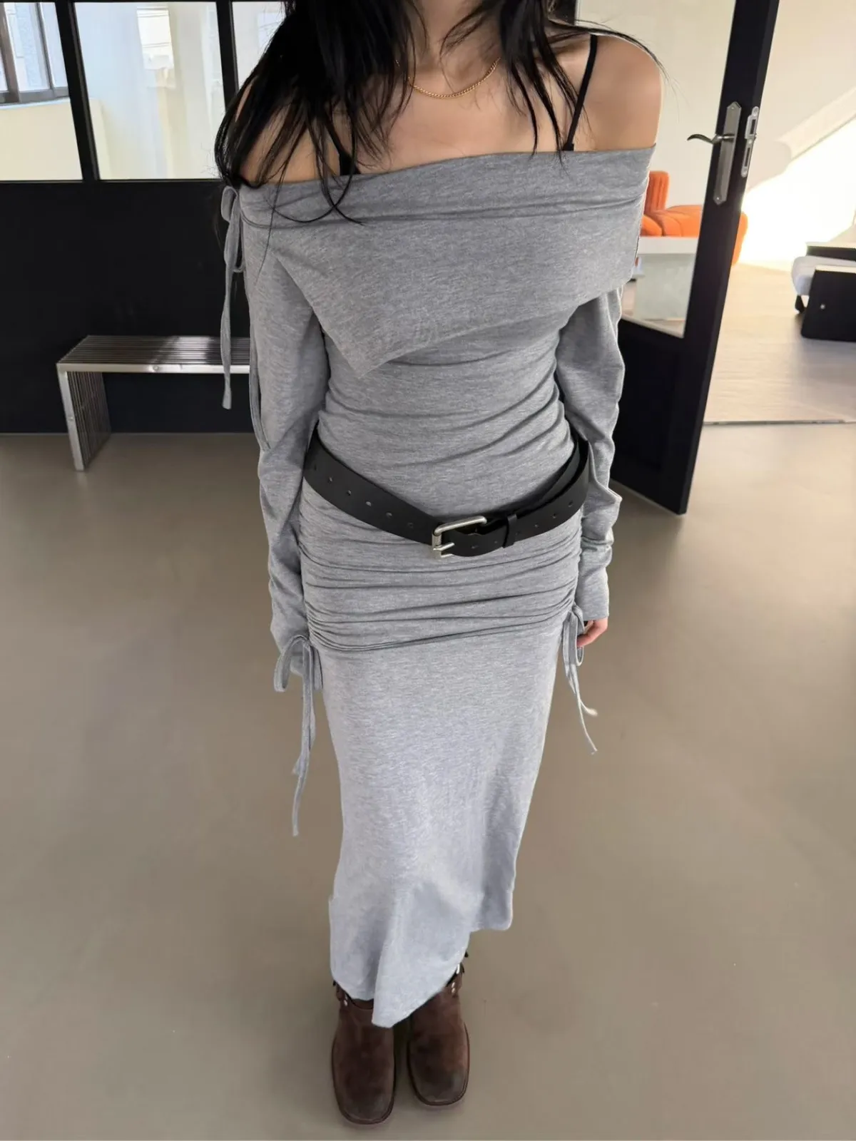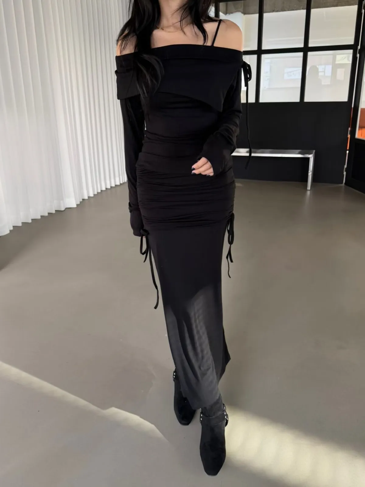一字領翻領上衣+側抽繩抓皺長裙 套裝