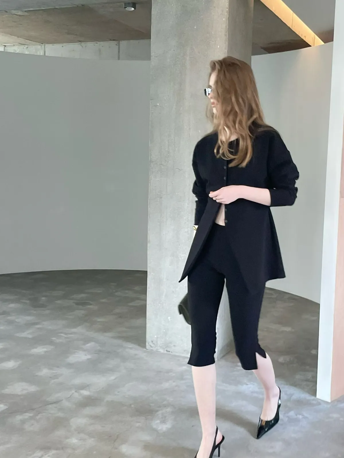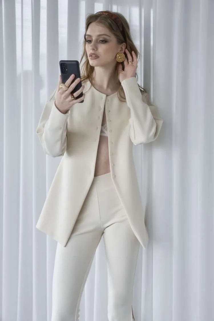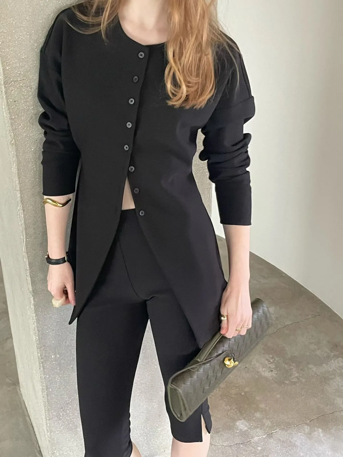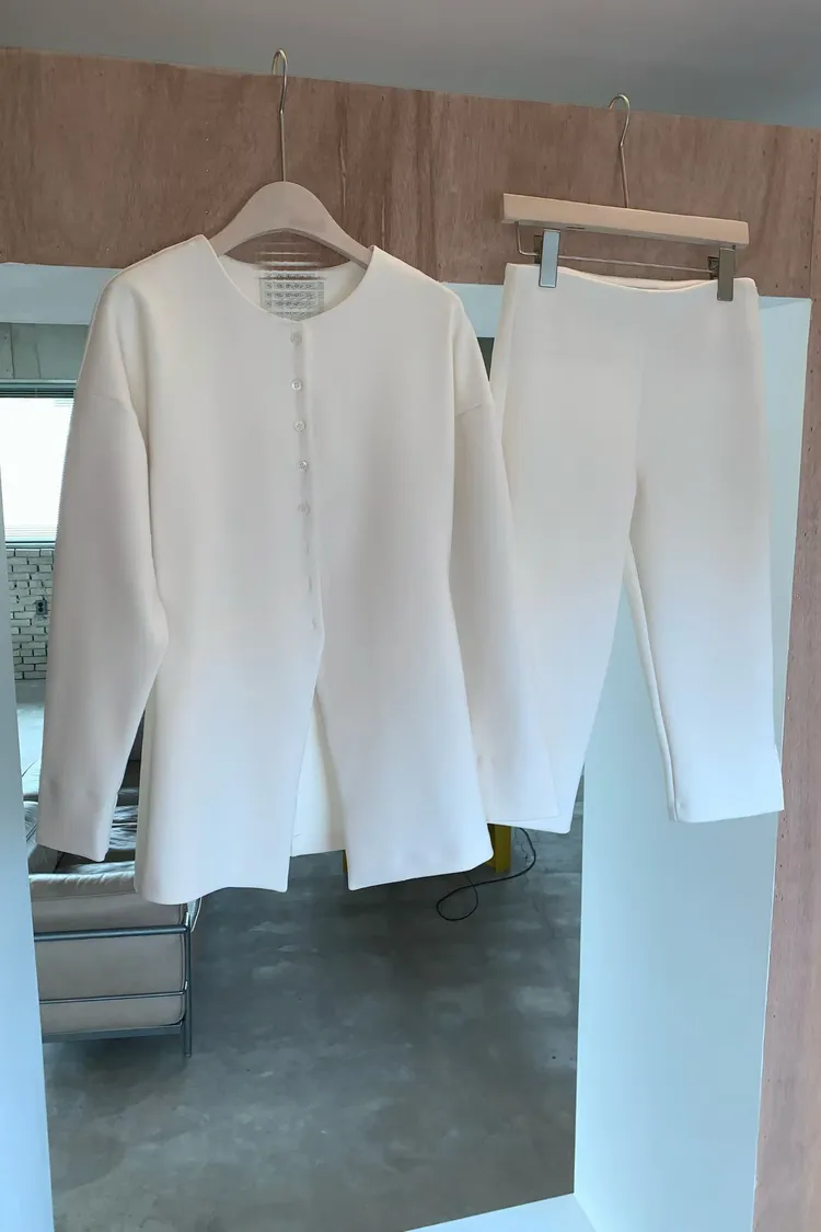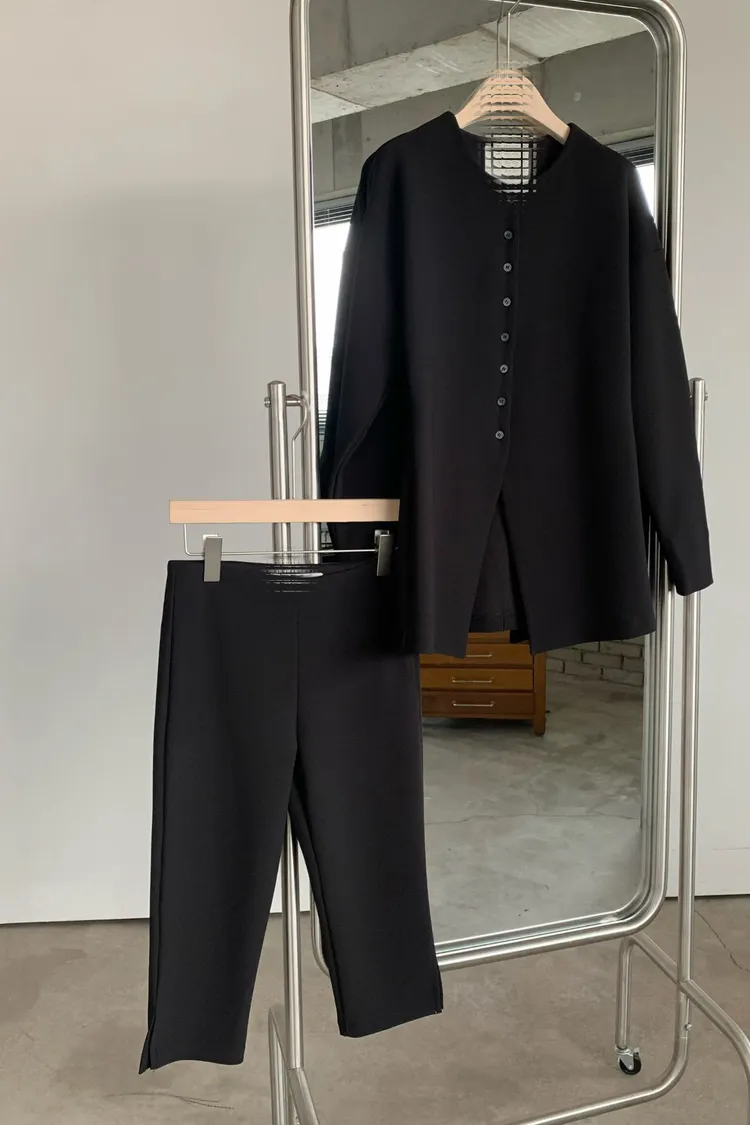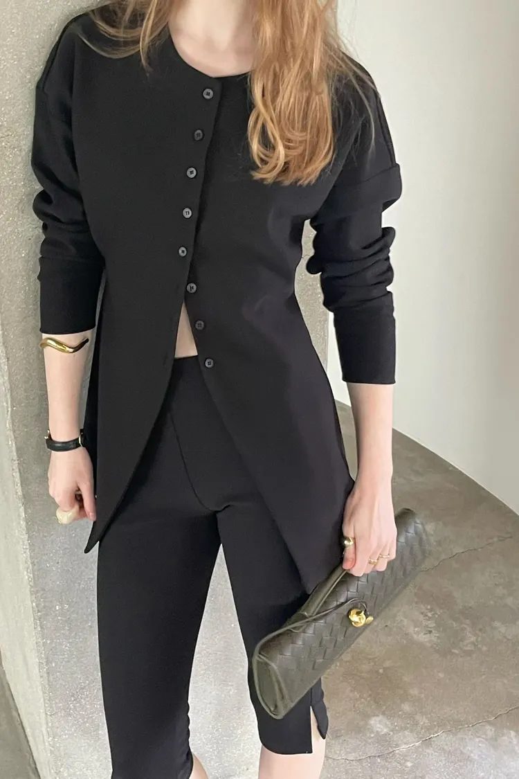 簡約圓領排釦合身開襟外+修身開衩五分合身褲