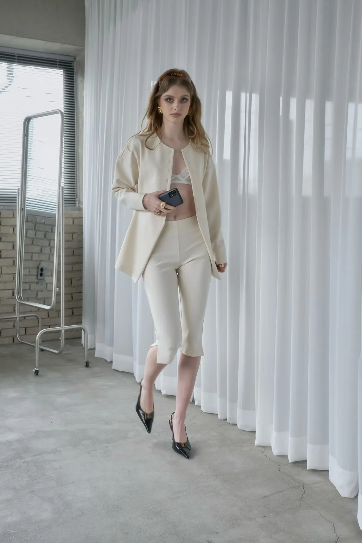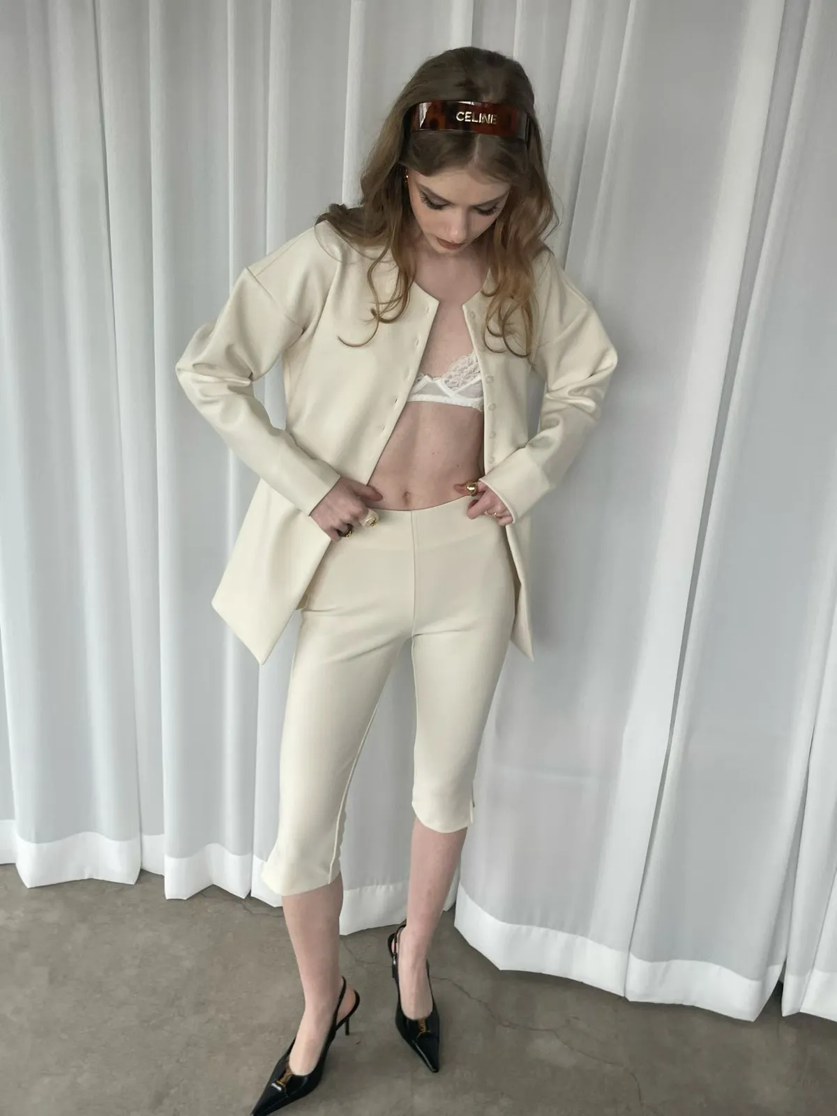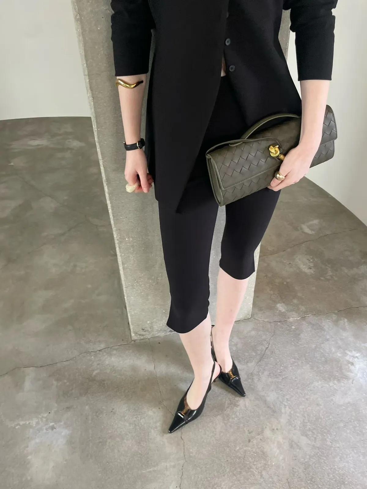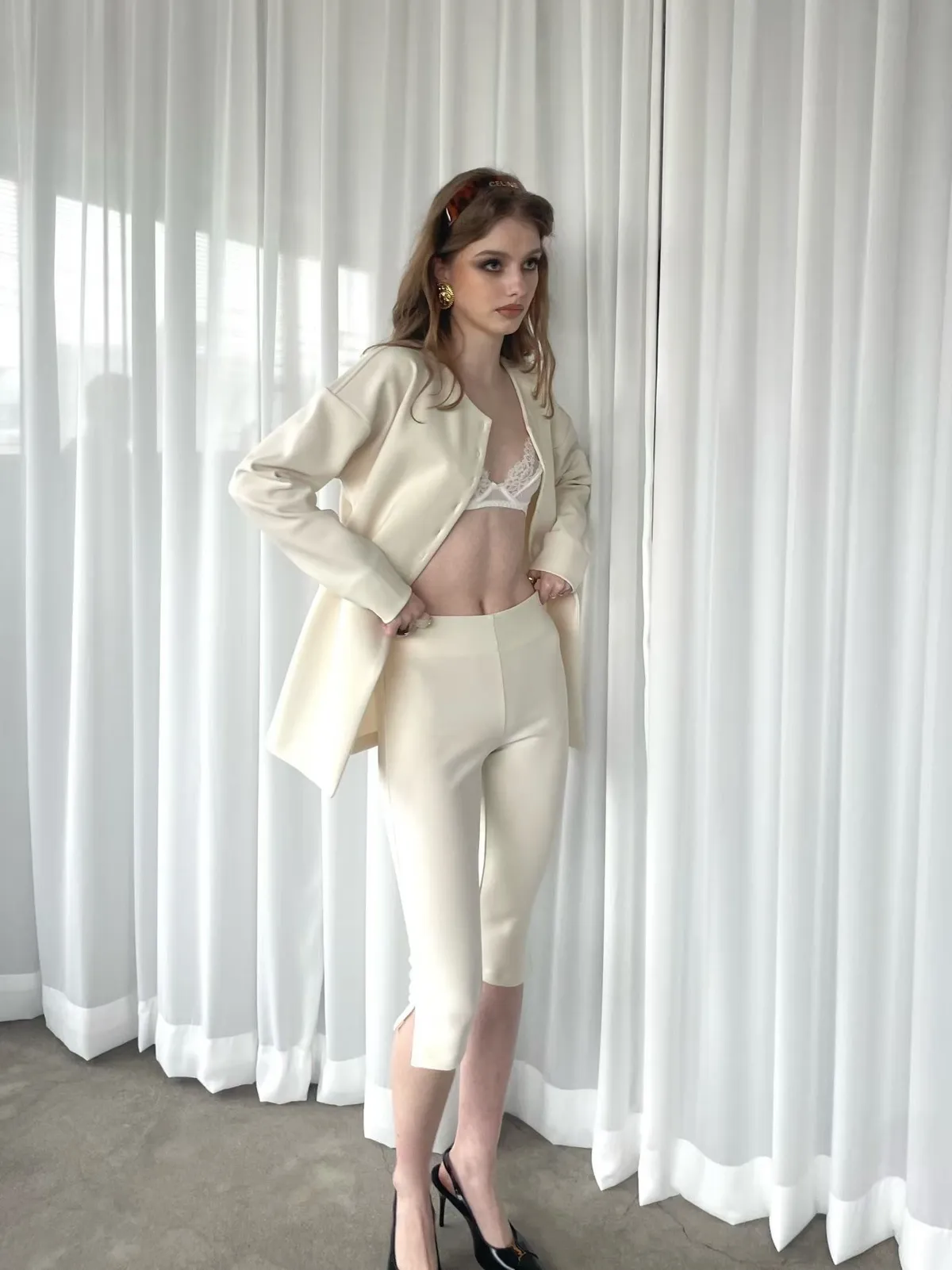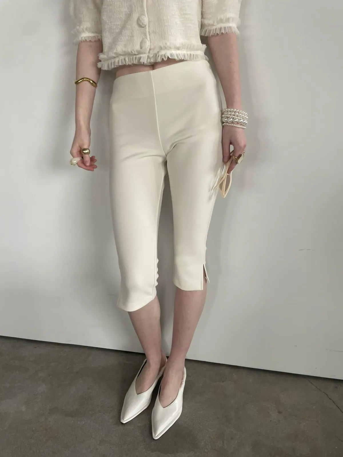 簡約圓領排釦合身開襟外+修身開衩五分合身褲