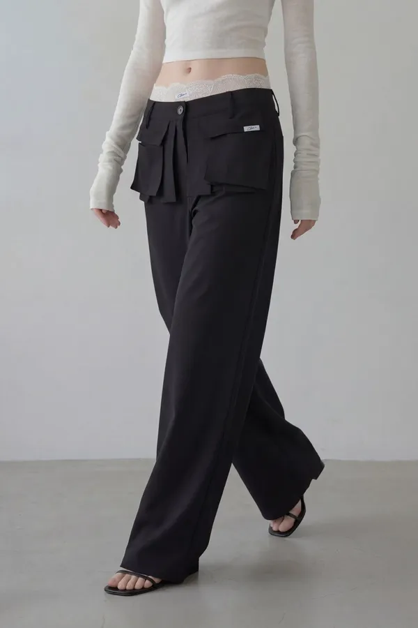 口袋造型高腰寬版長褲