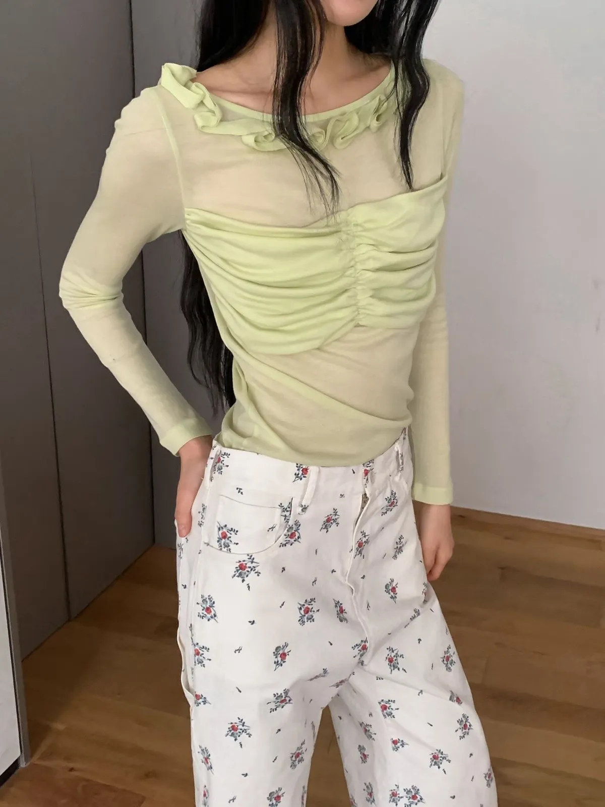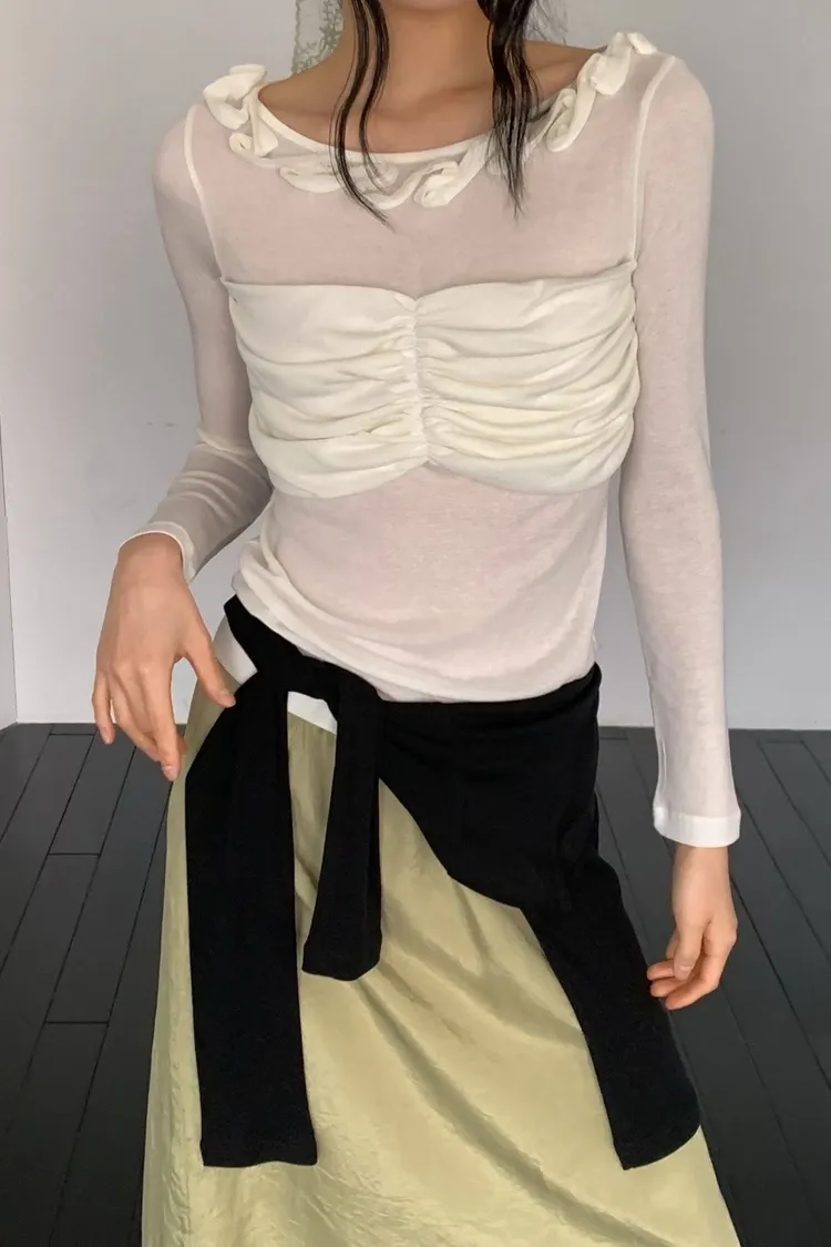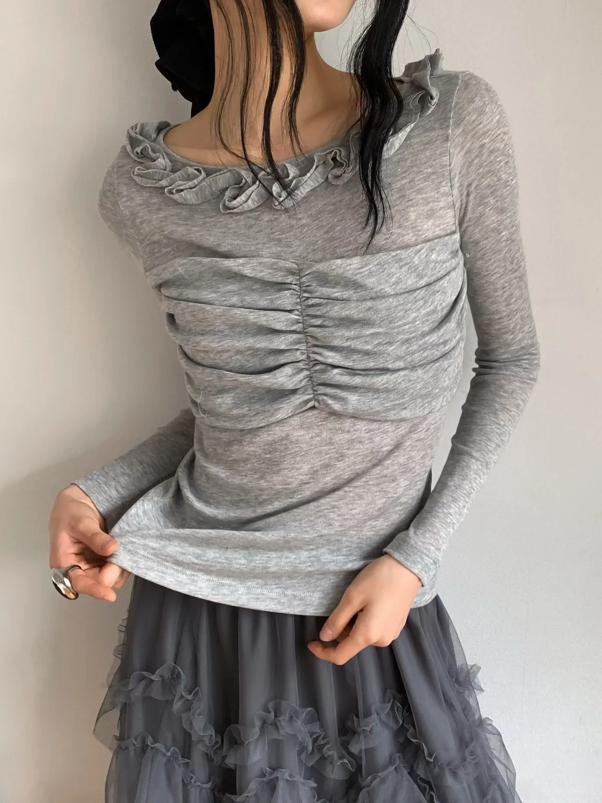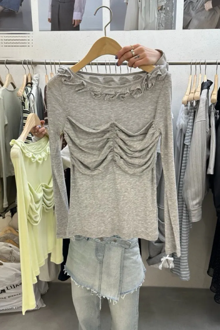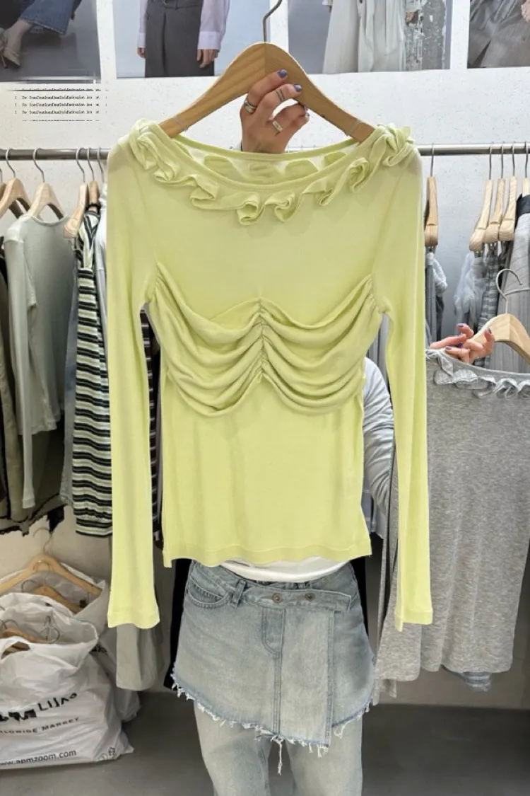 荷葉領抓皺修身長袖上衣
