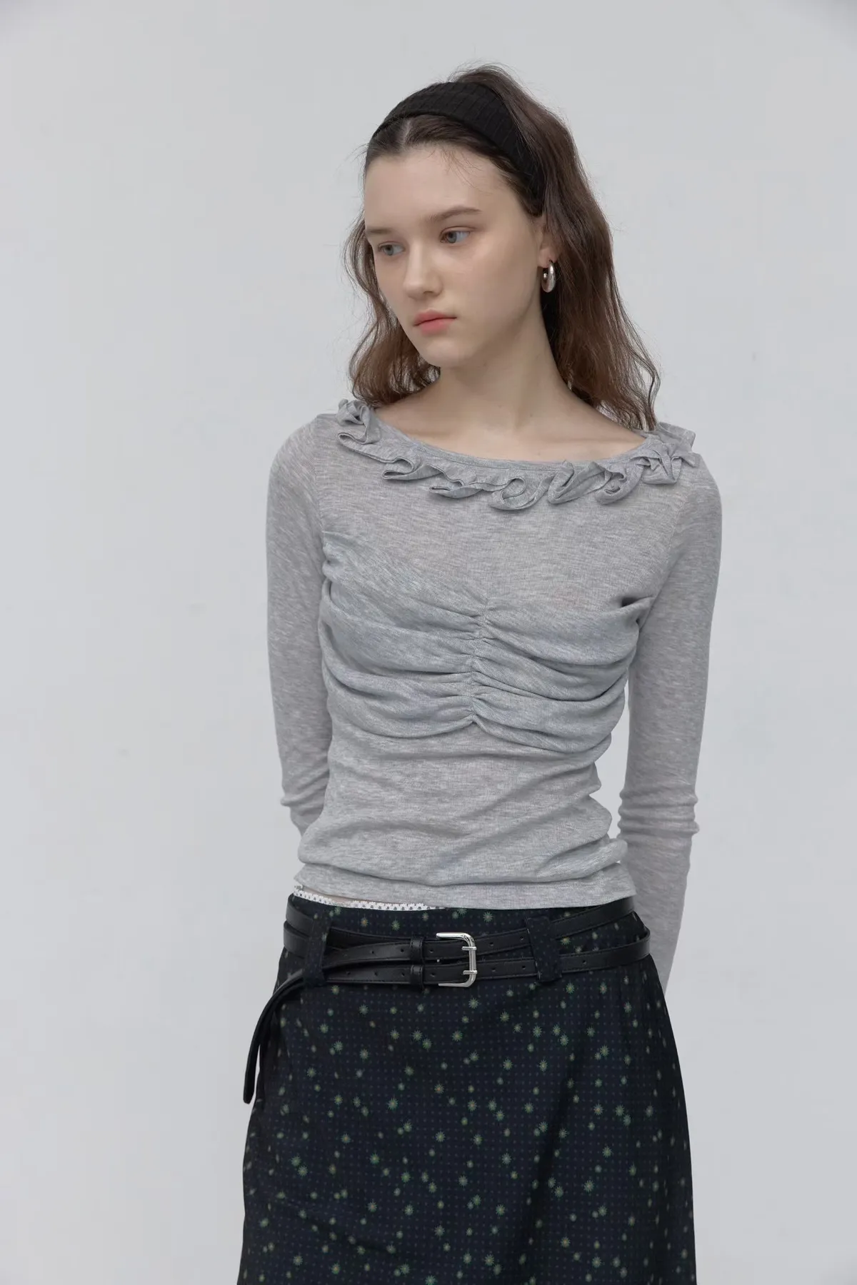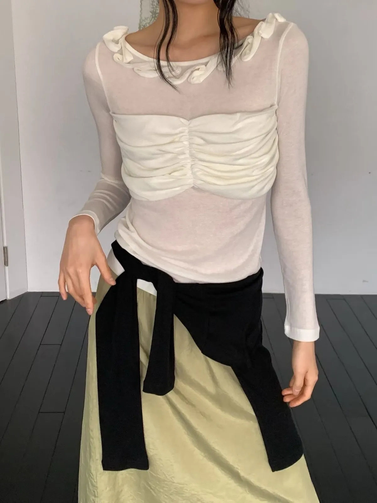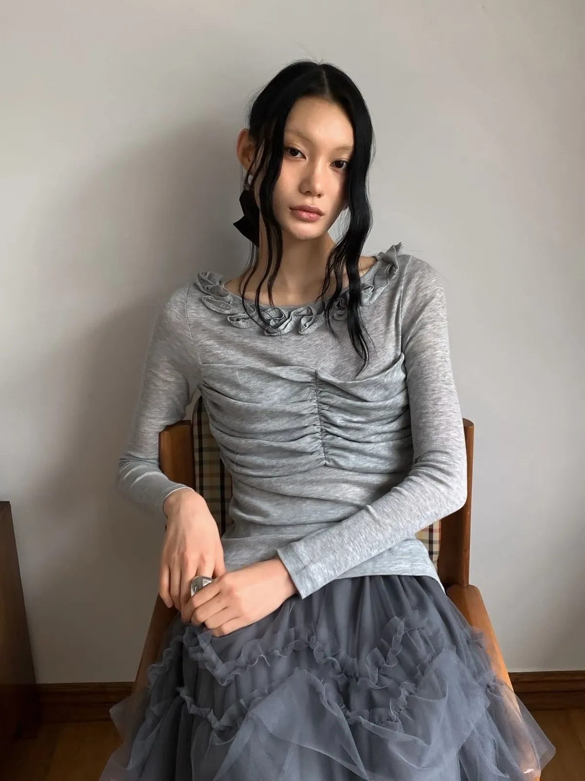 荷葉領抓皺修身長袖上衣