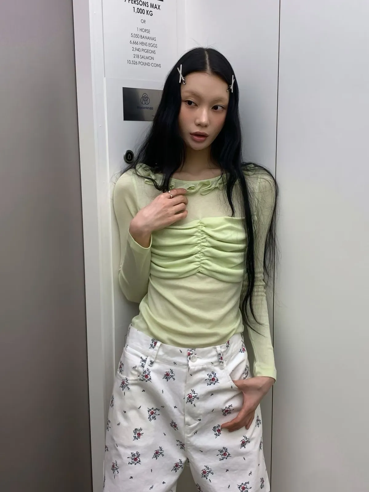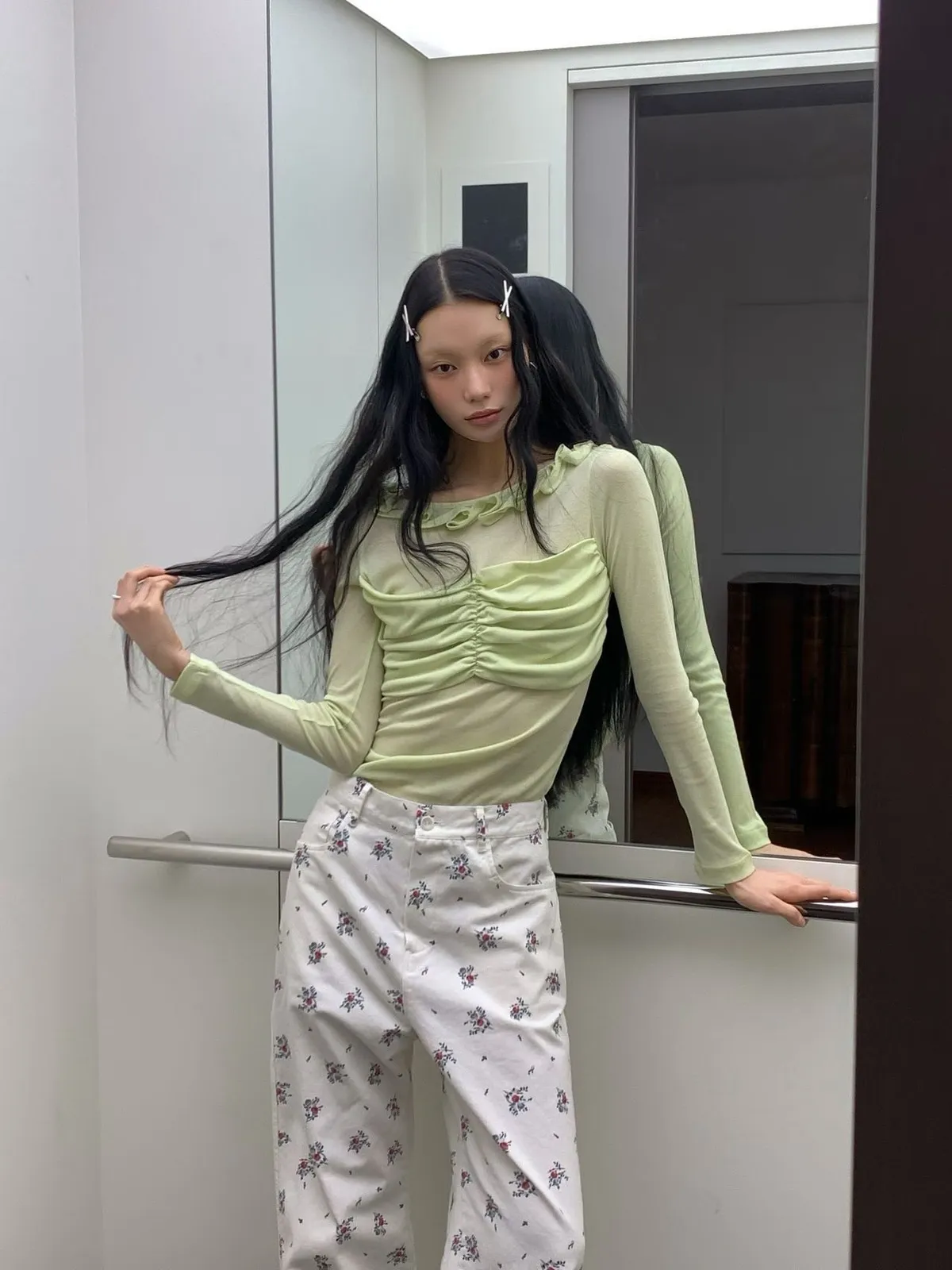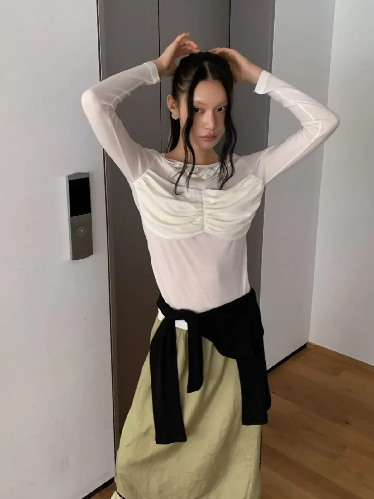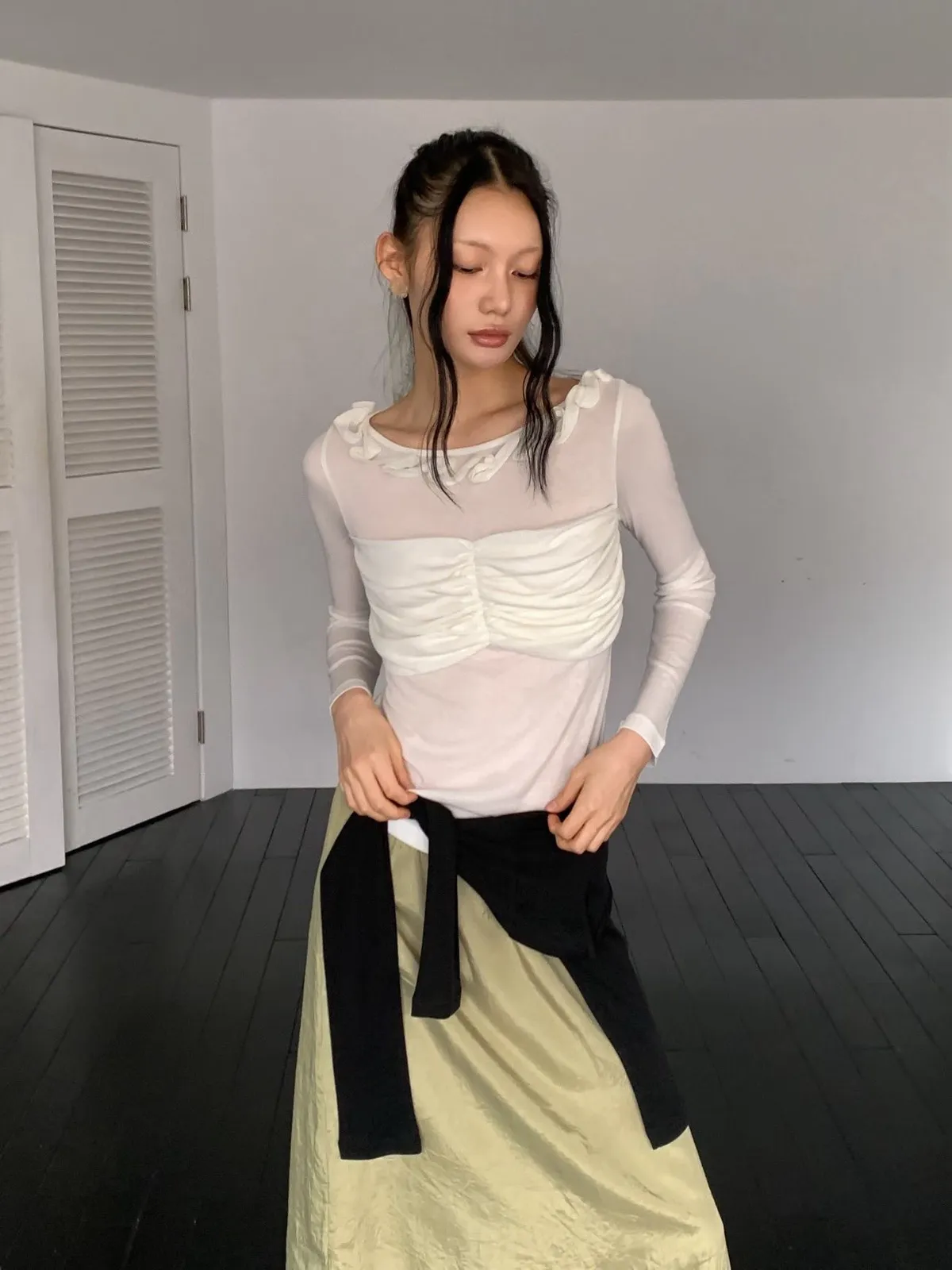 荷葉領抓皺修身長袖上衣