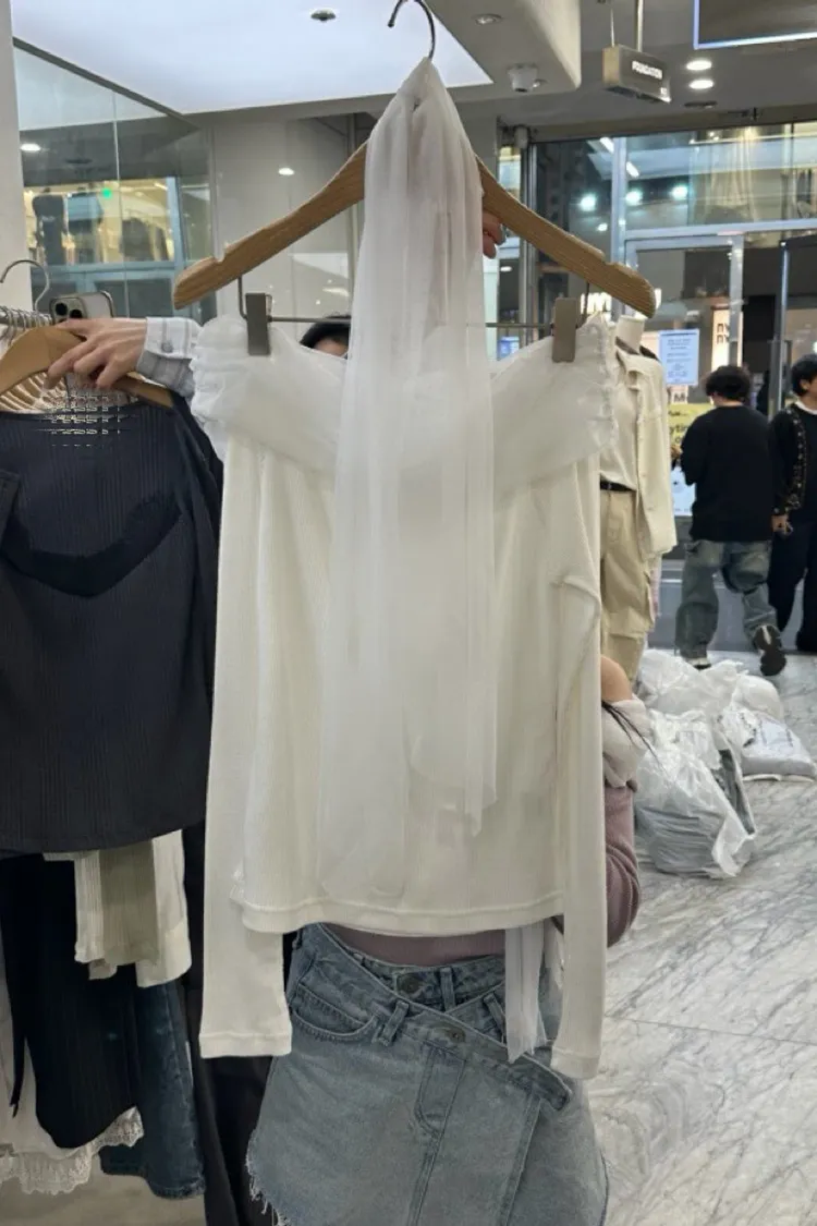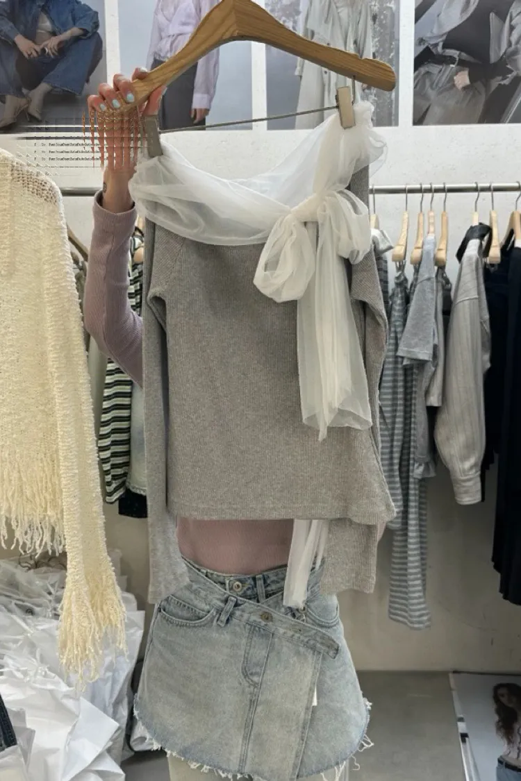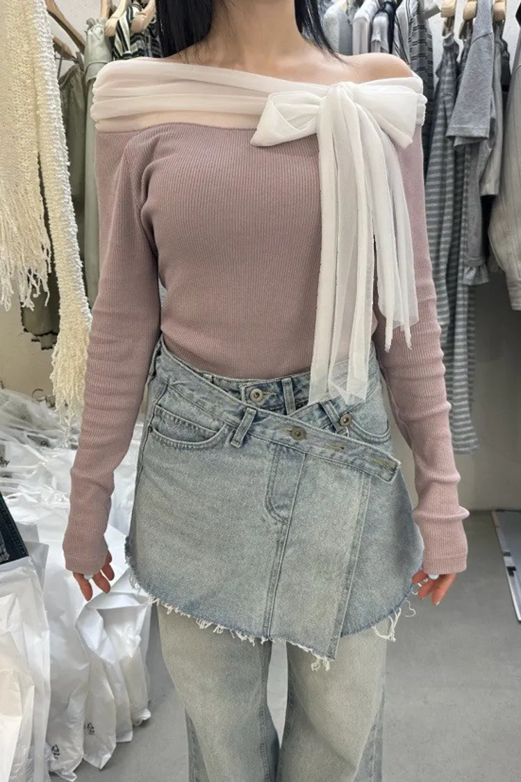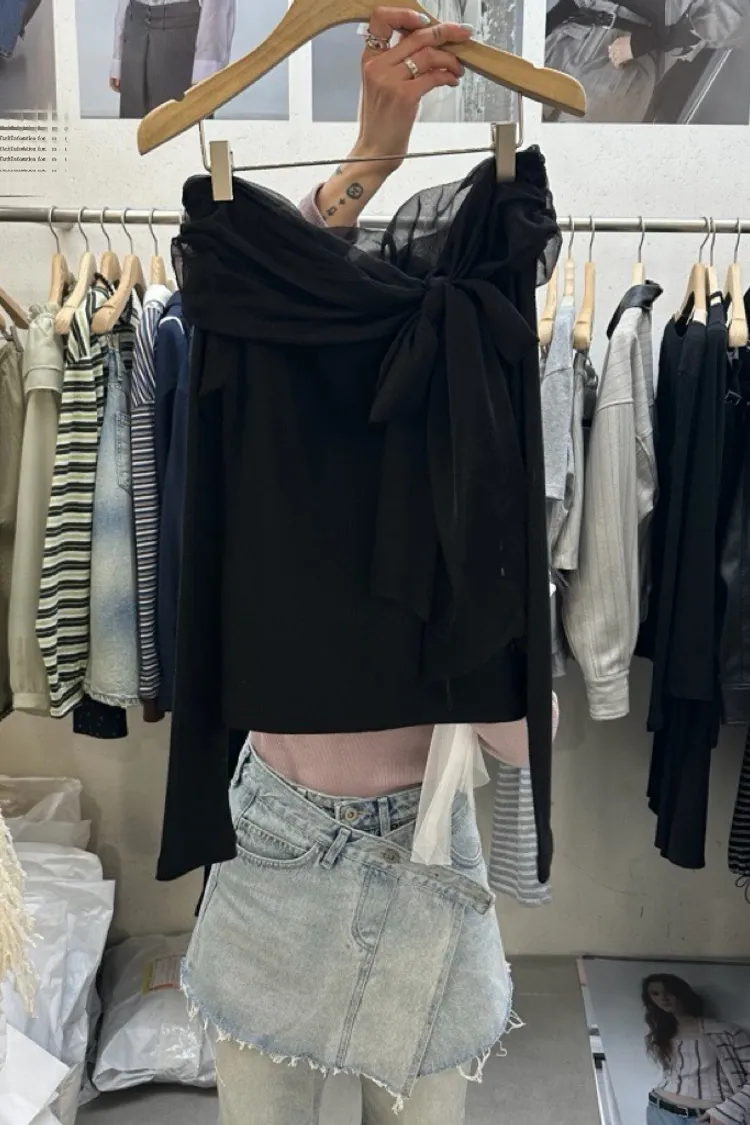 氣質紗蝴蝶結一字領上衣