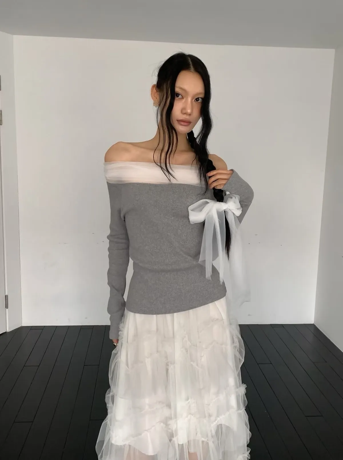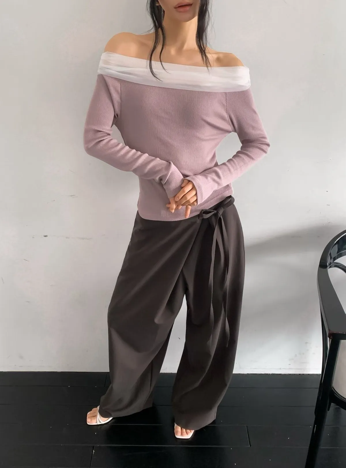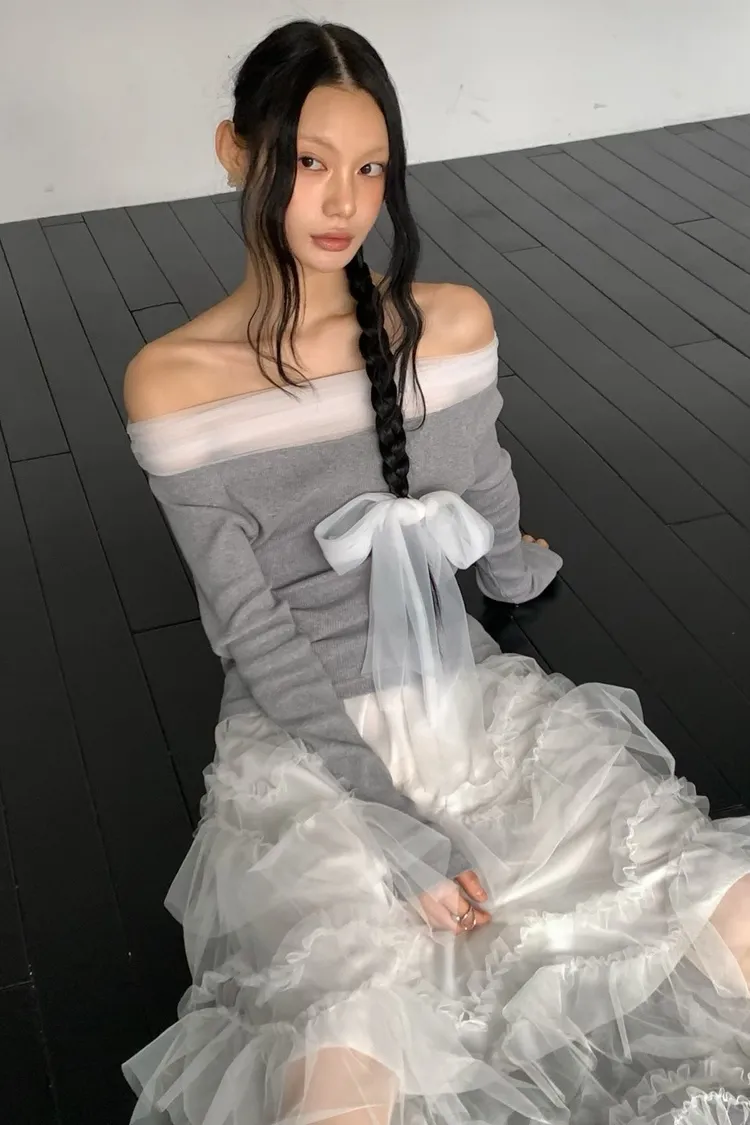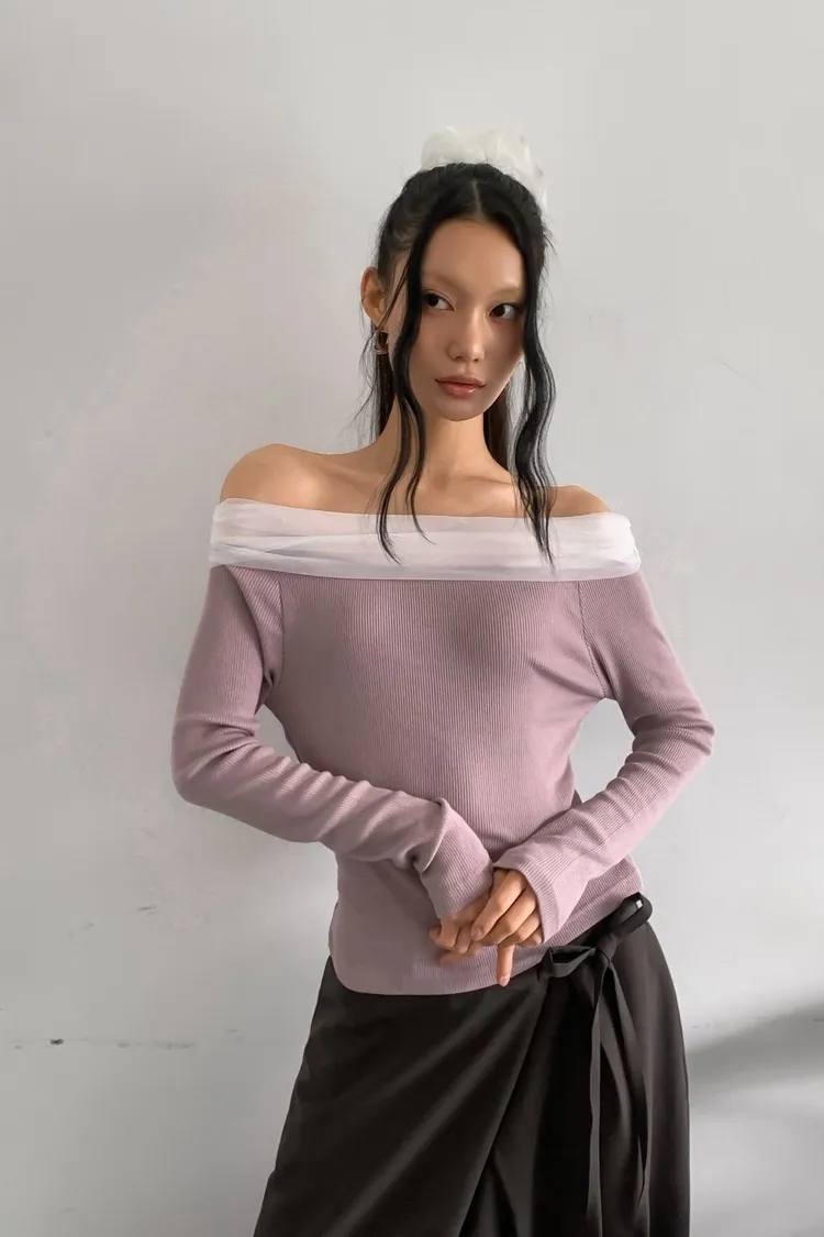 氣質紗蝴蝶結一字領上衣