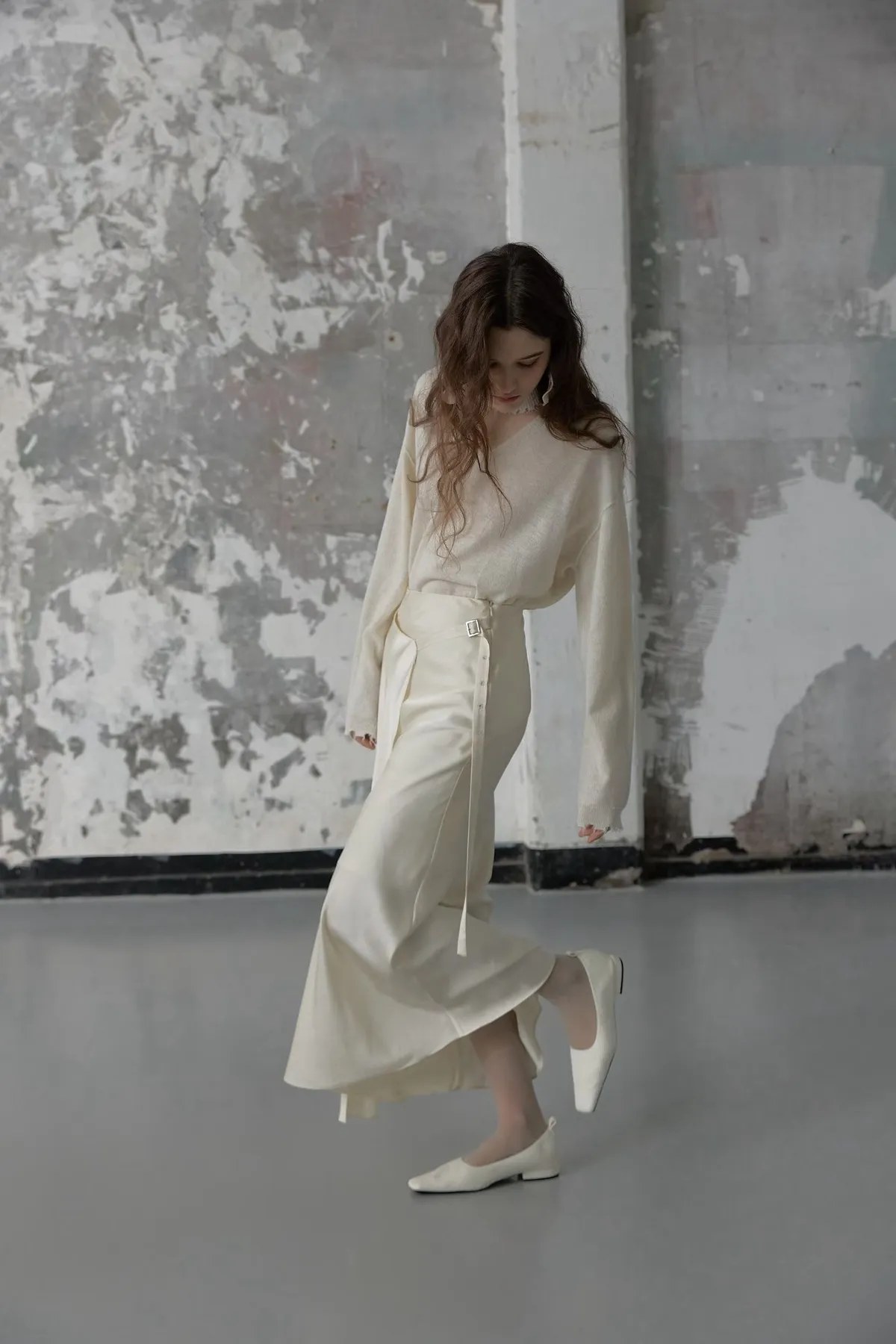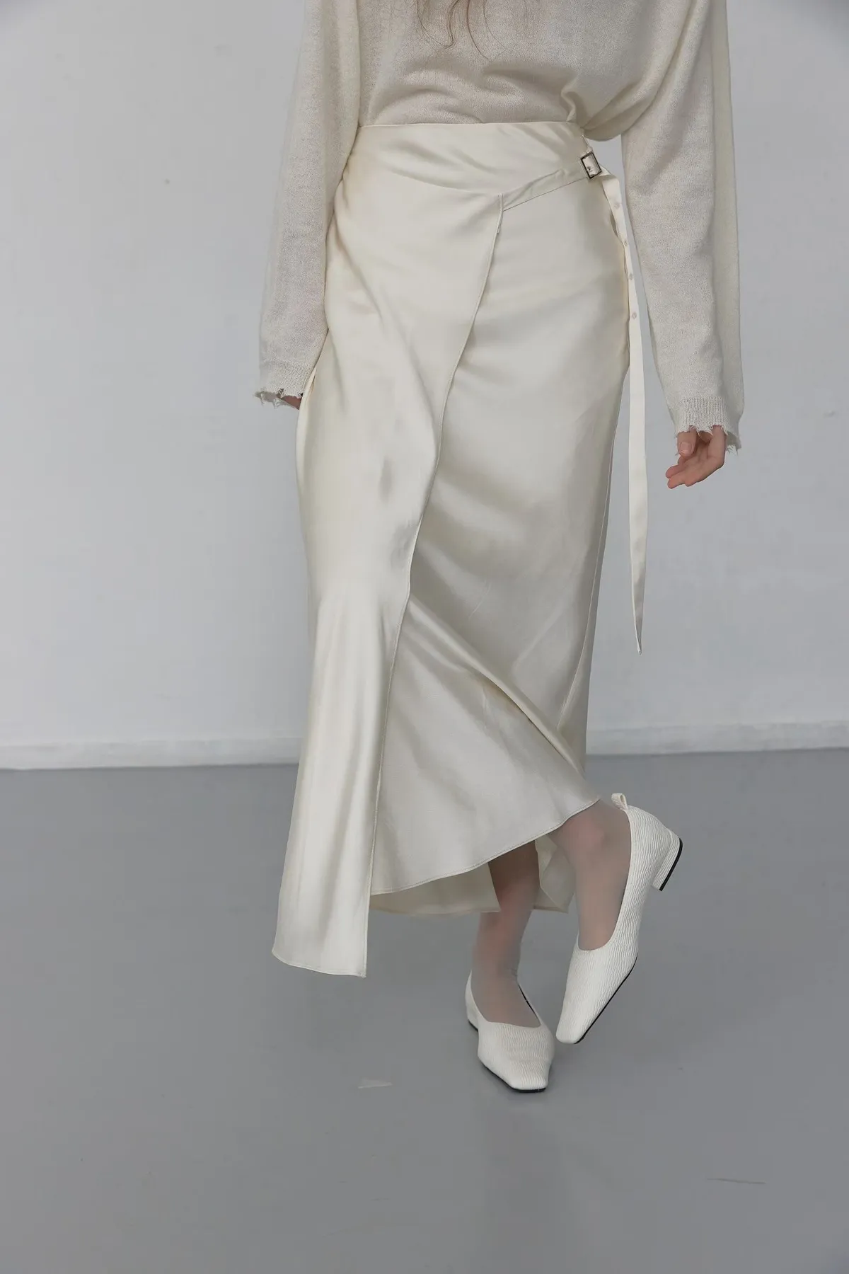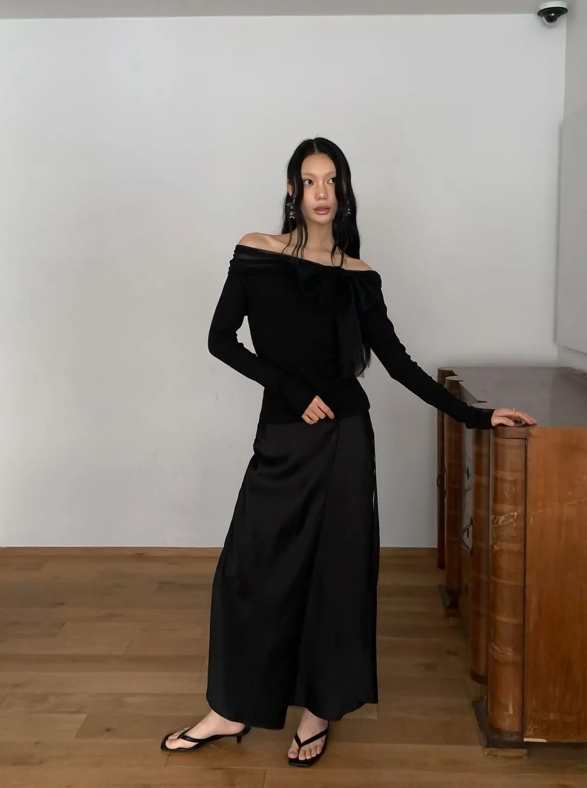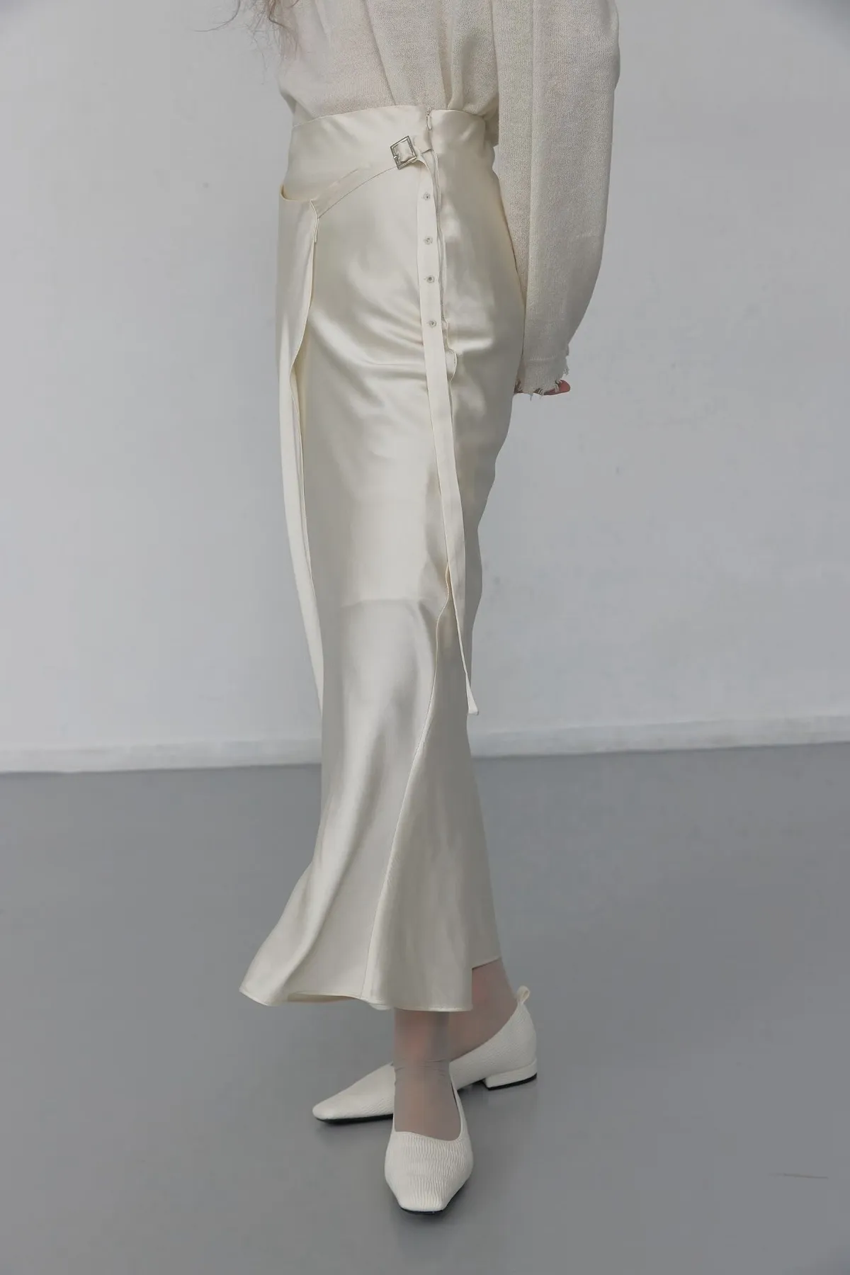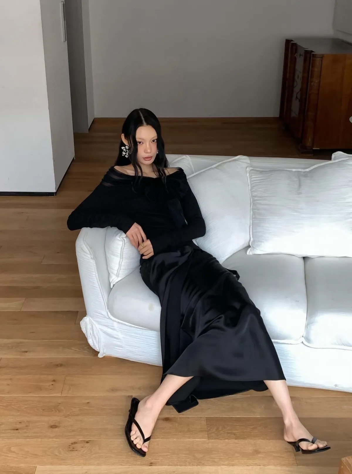 緞面垂墜感不對稱設計長裙