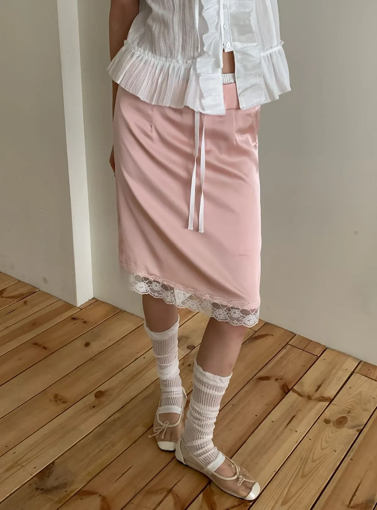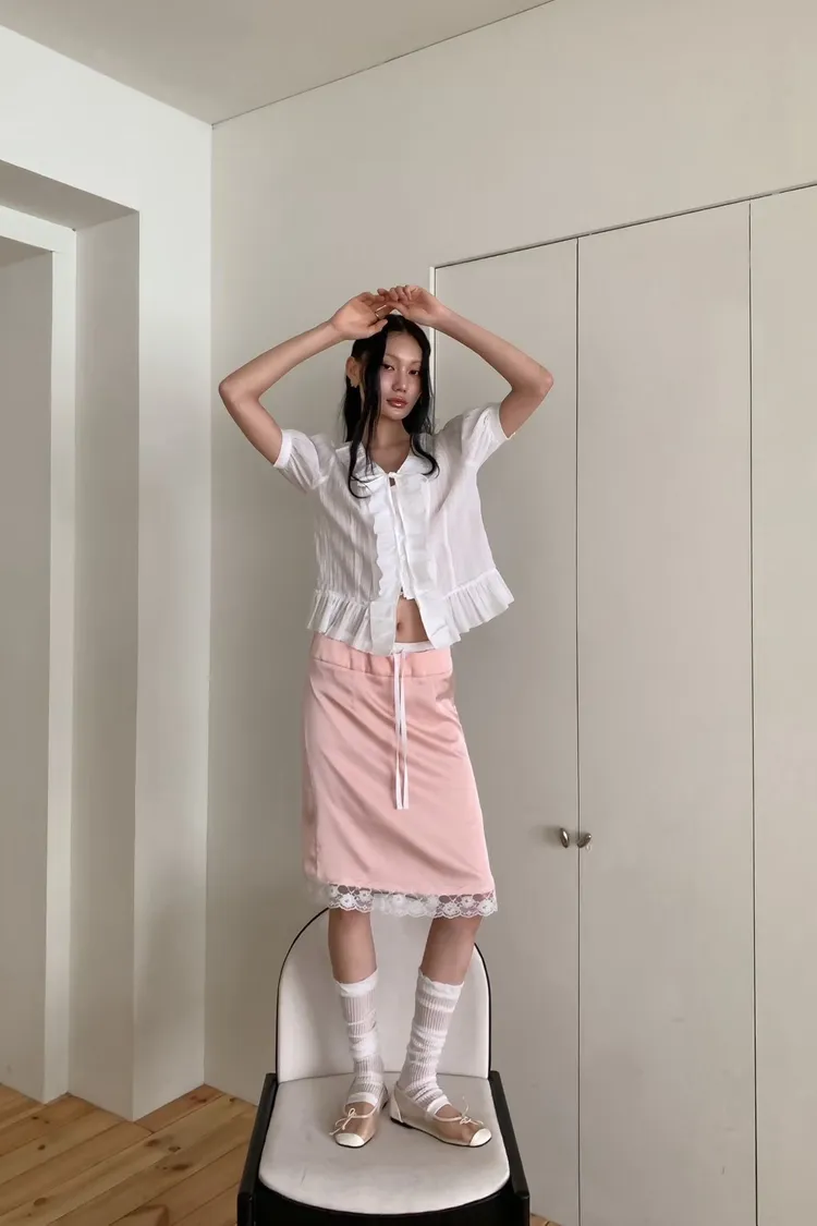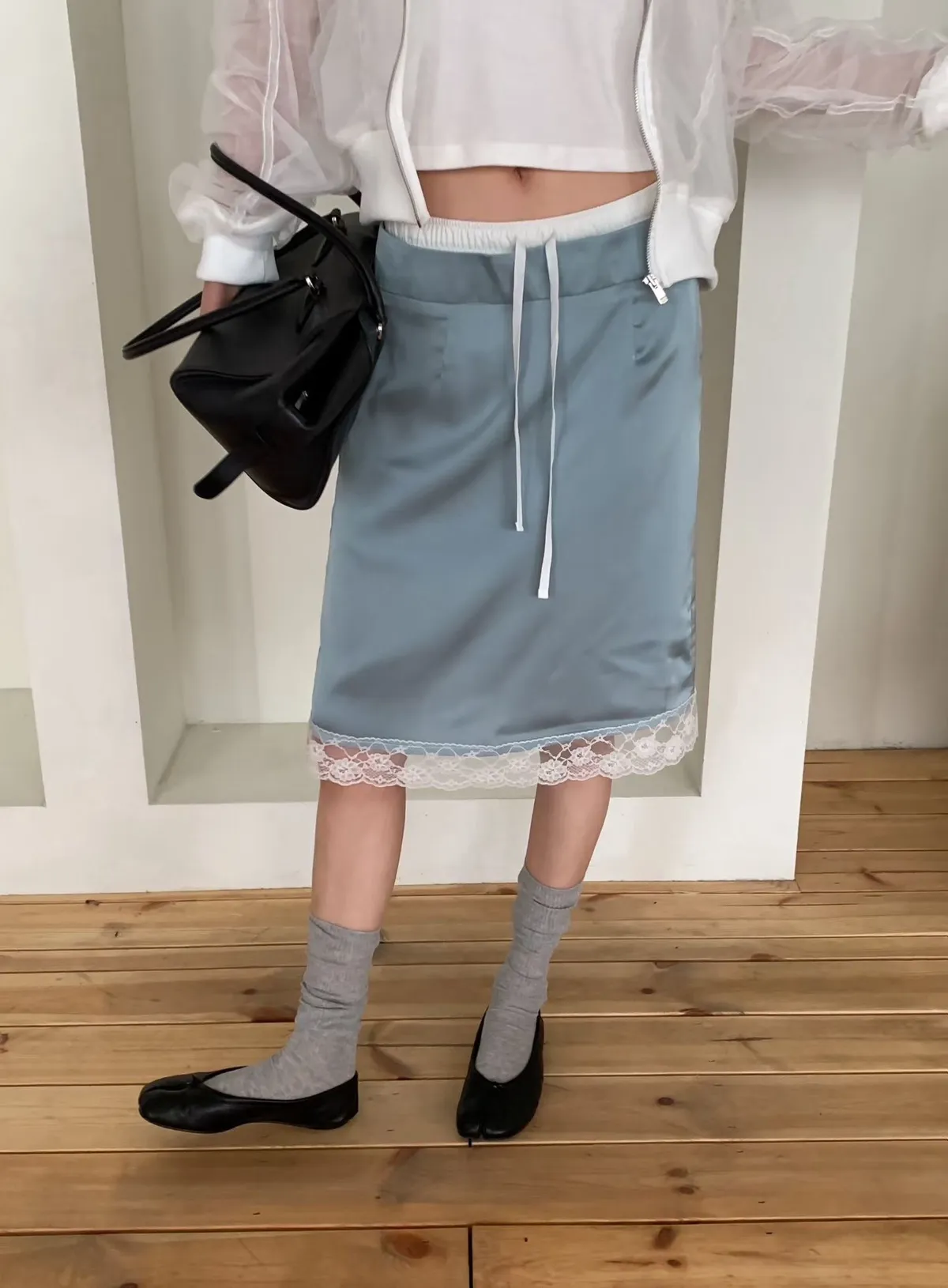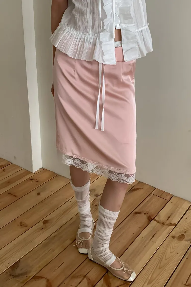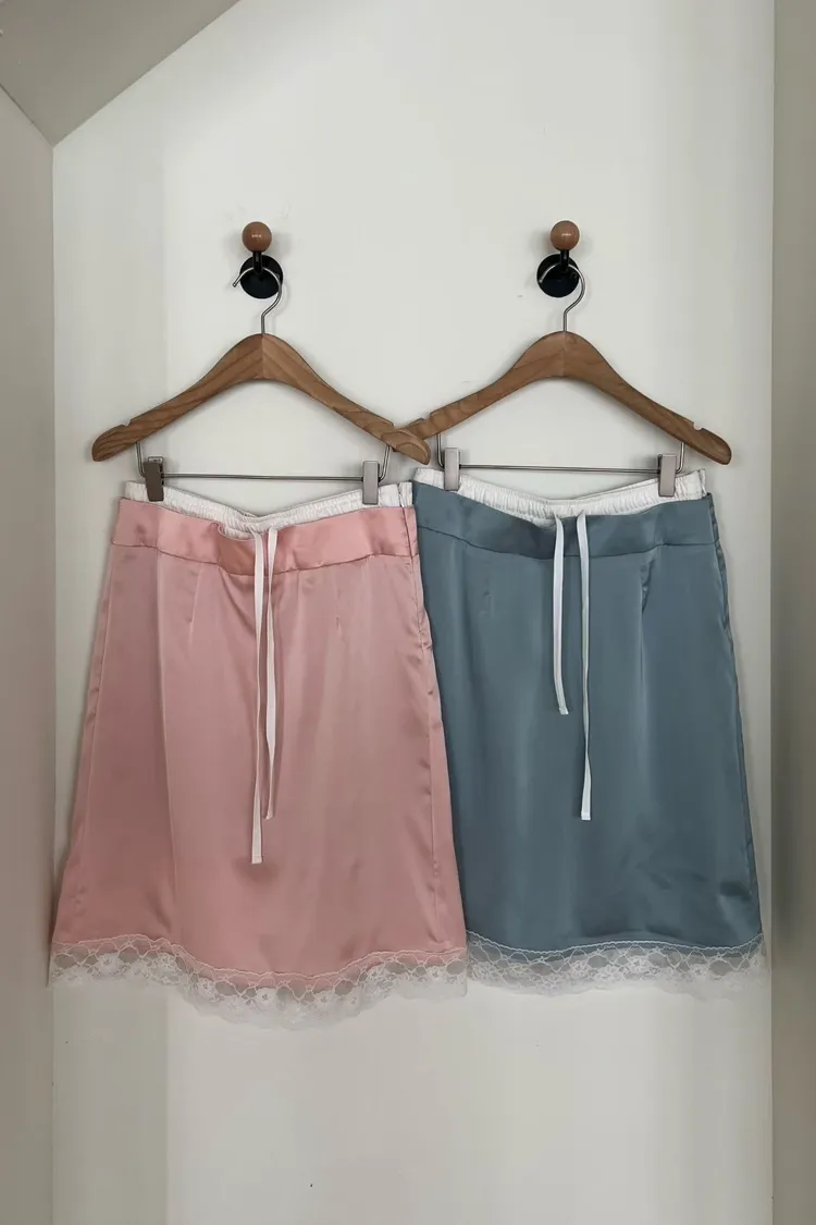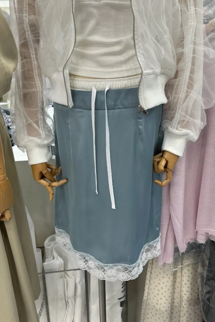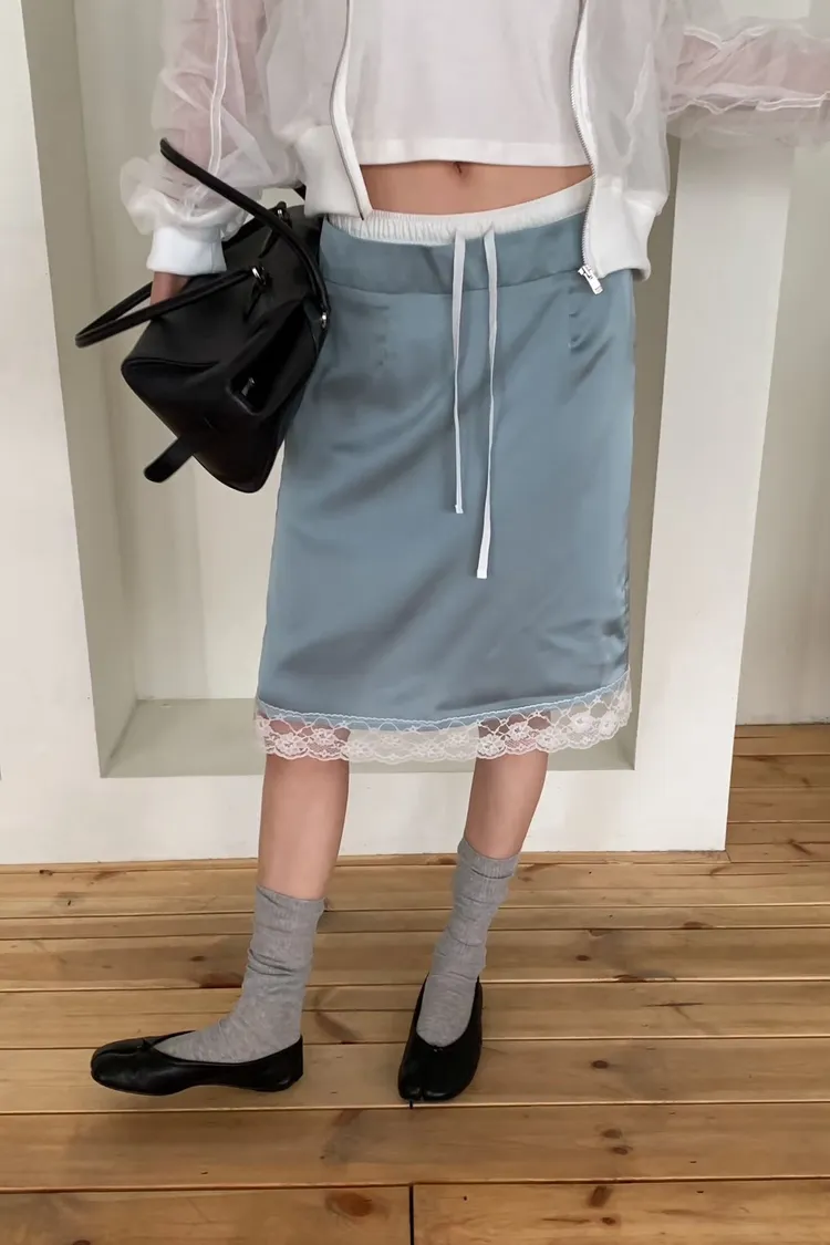 緞面蕾絲拼接抽繩鬆緊腰中長裙