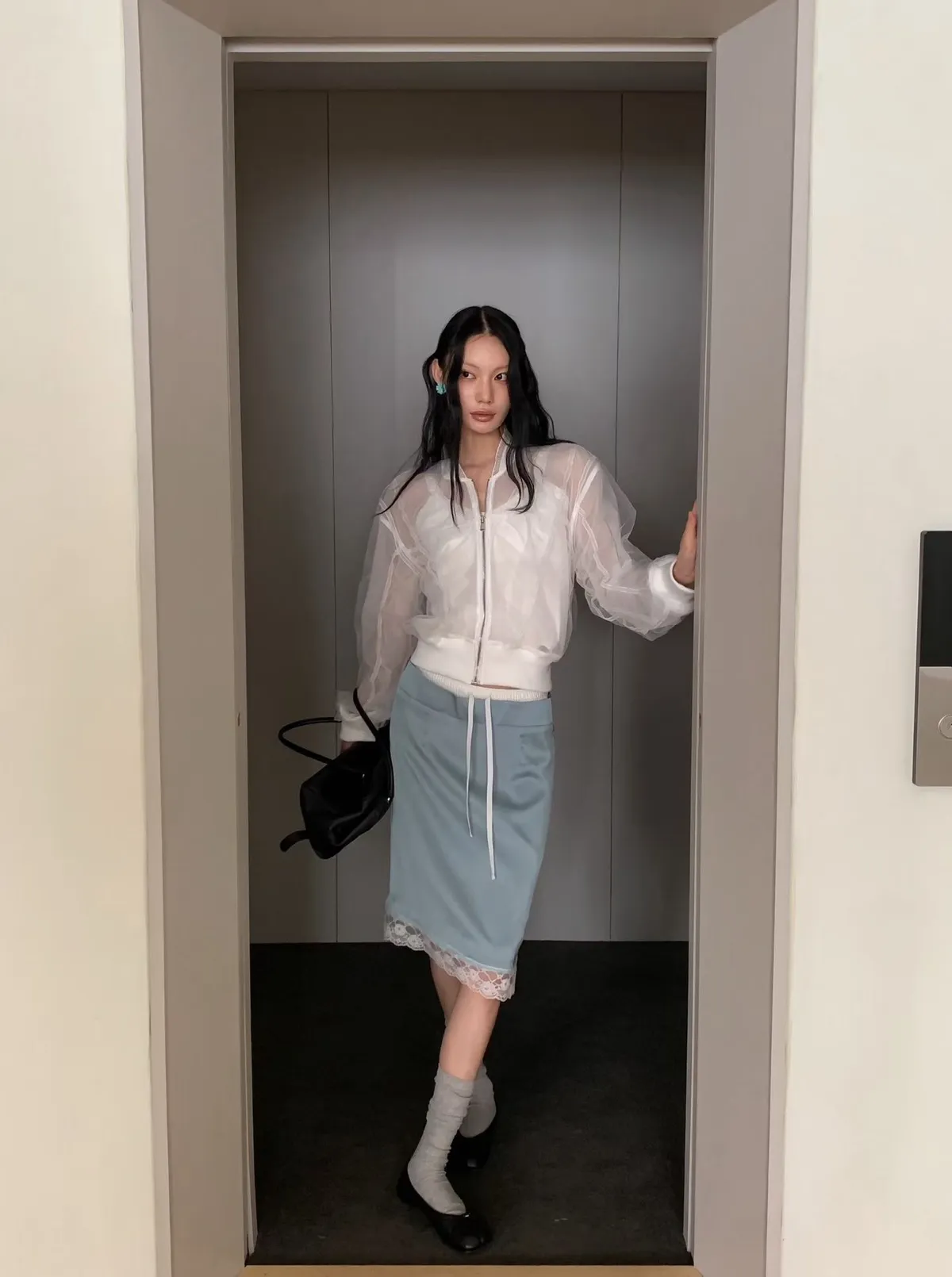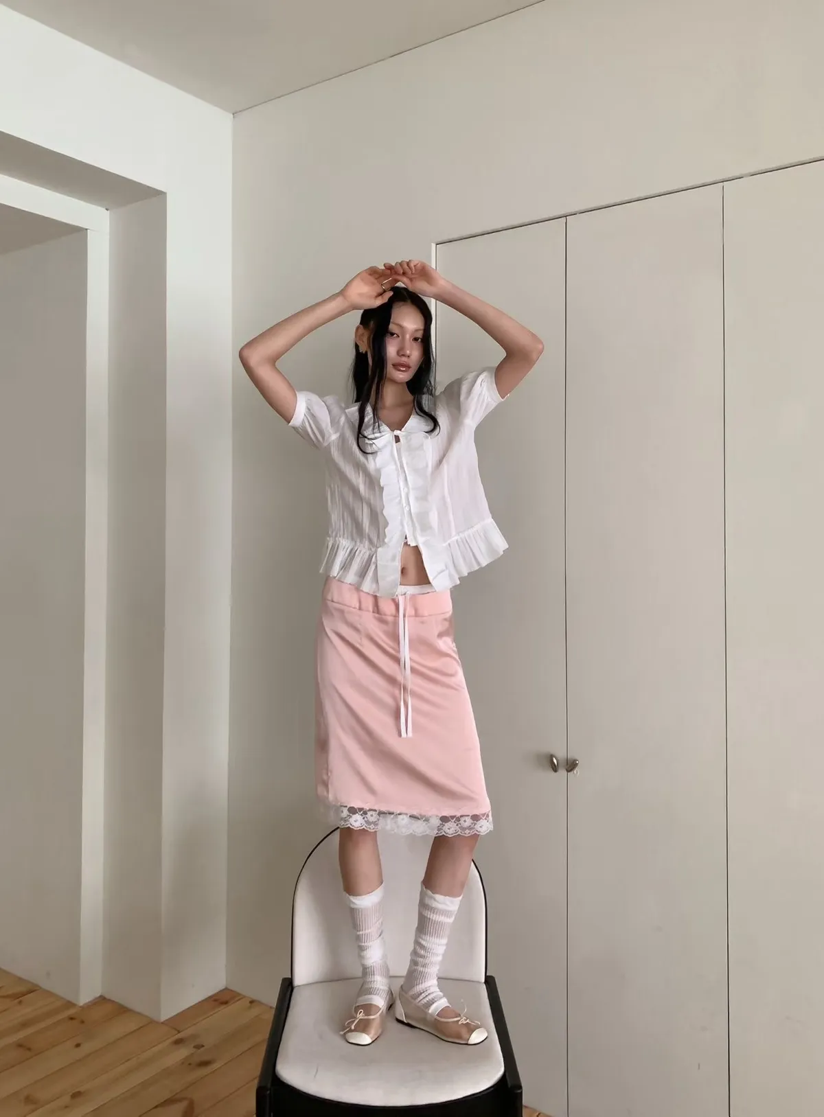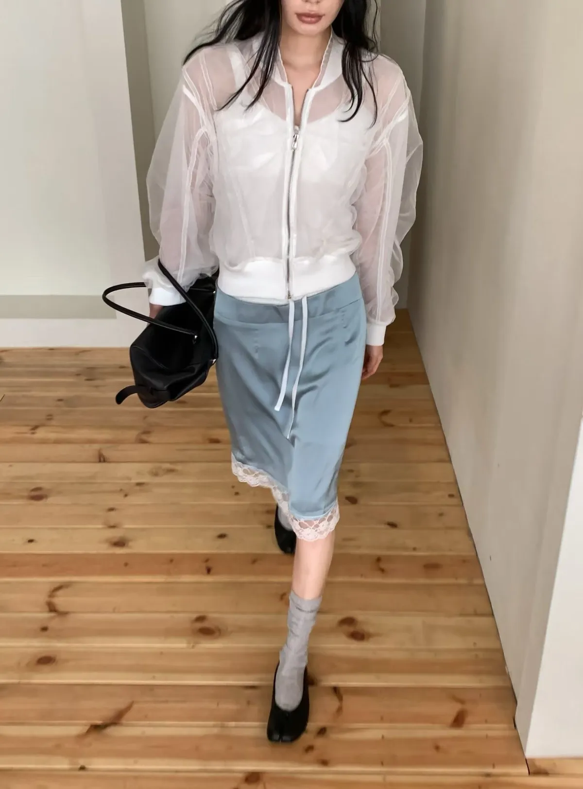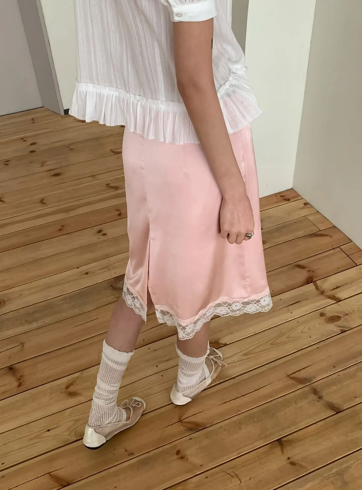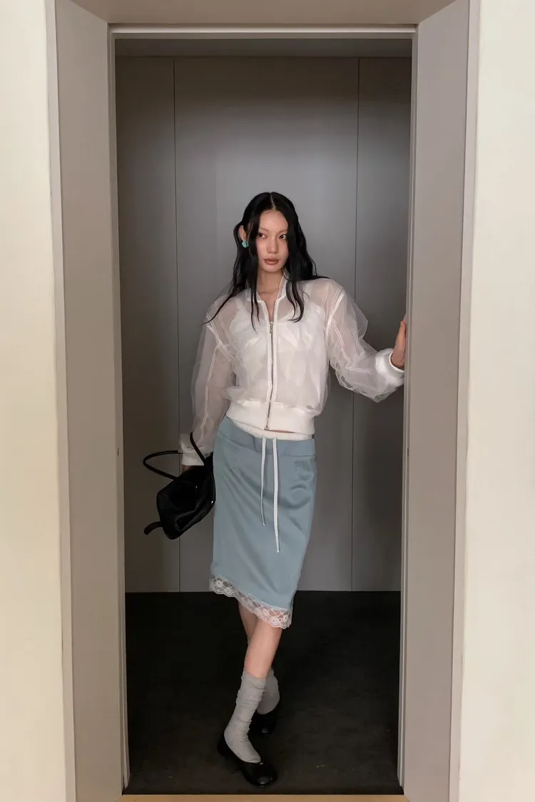 緞面蕾絲拼接抽繩鬆緊腰中長裙
