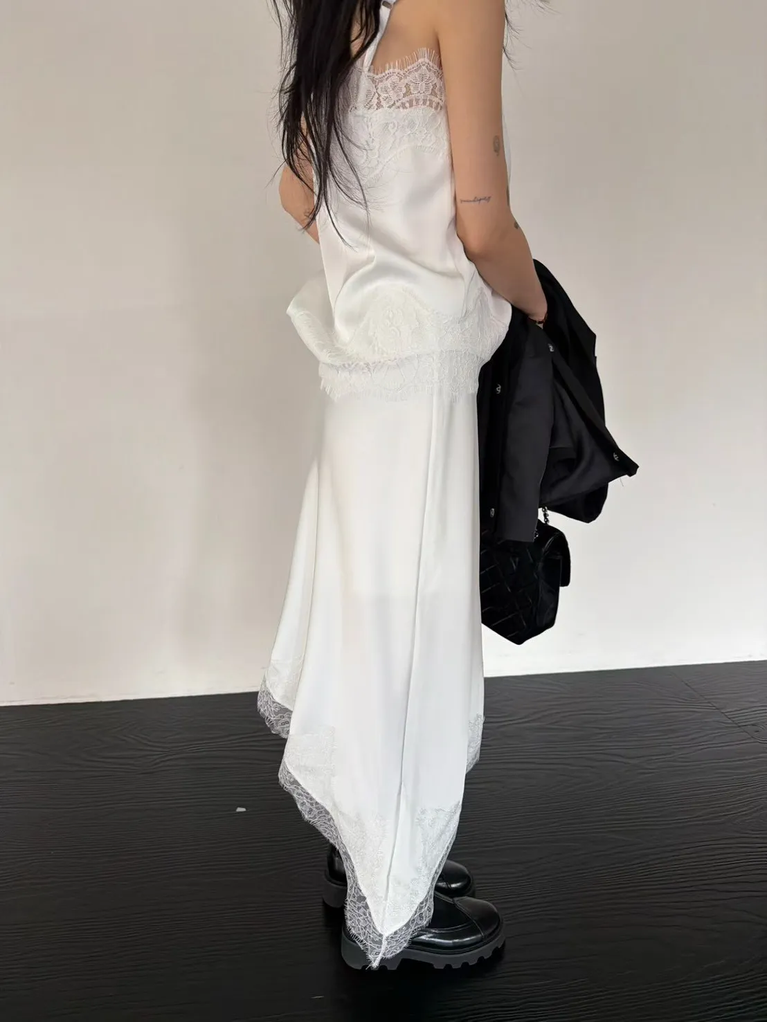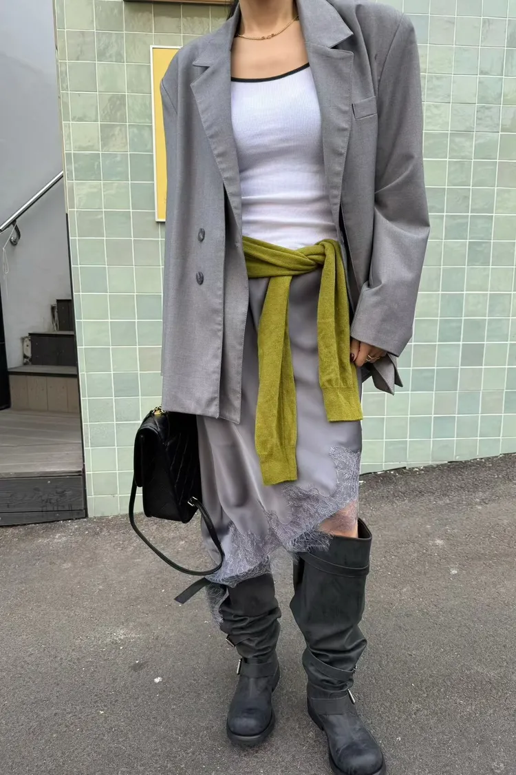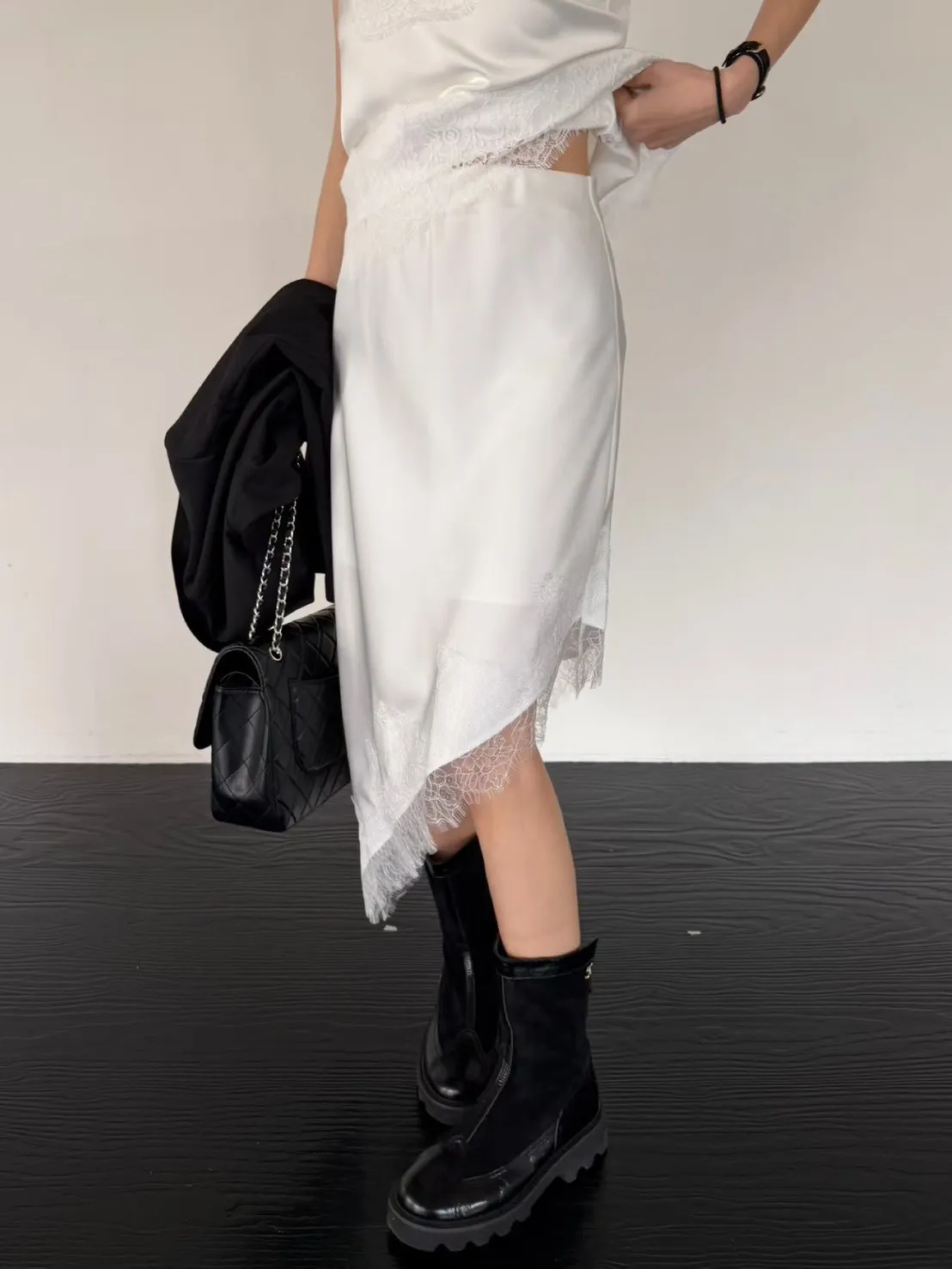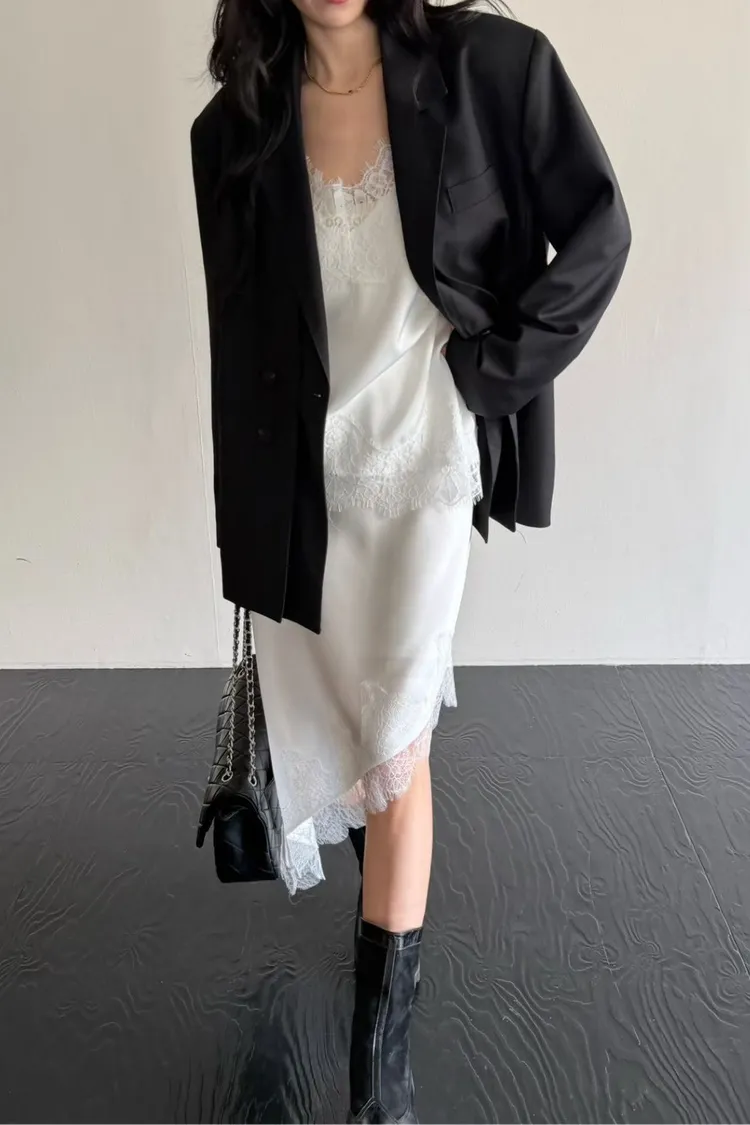 下擺斜邊蕾絲中長裙