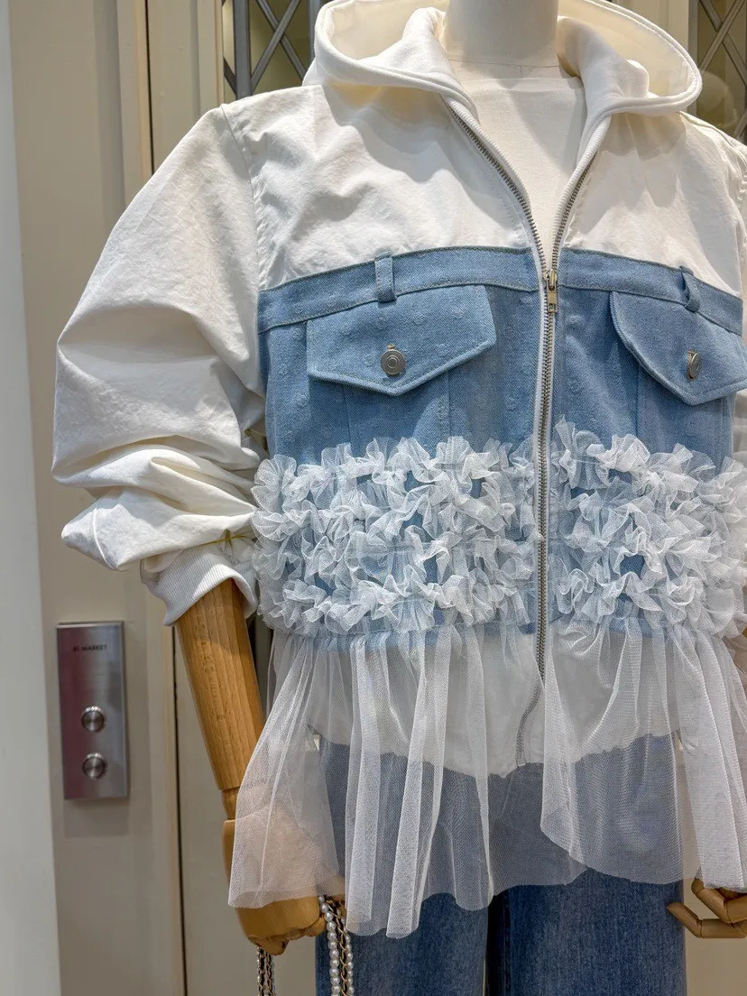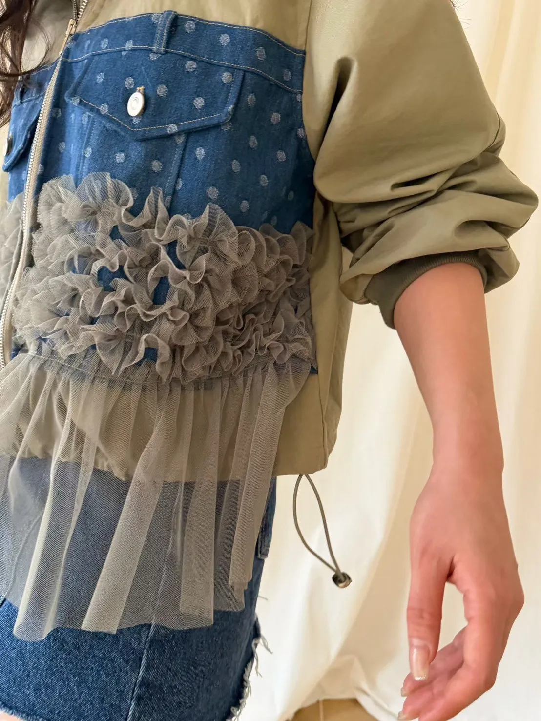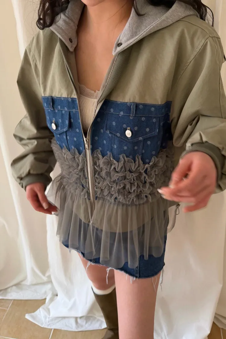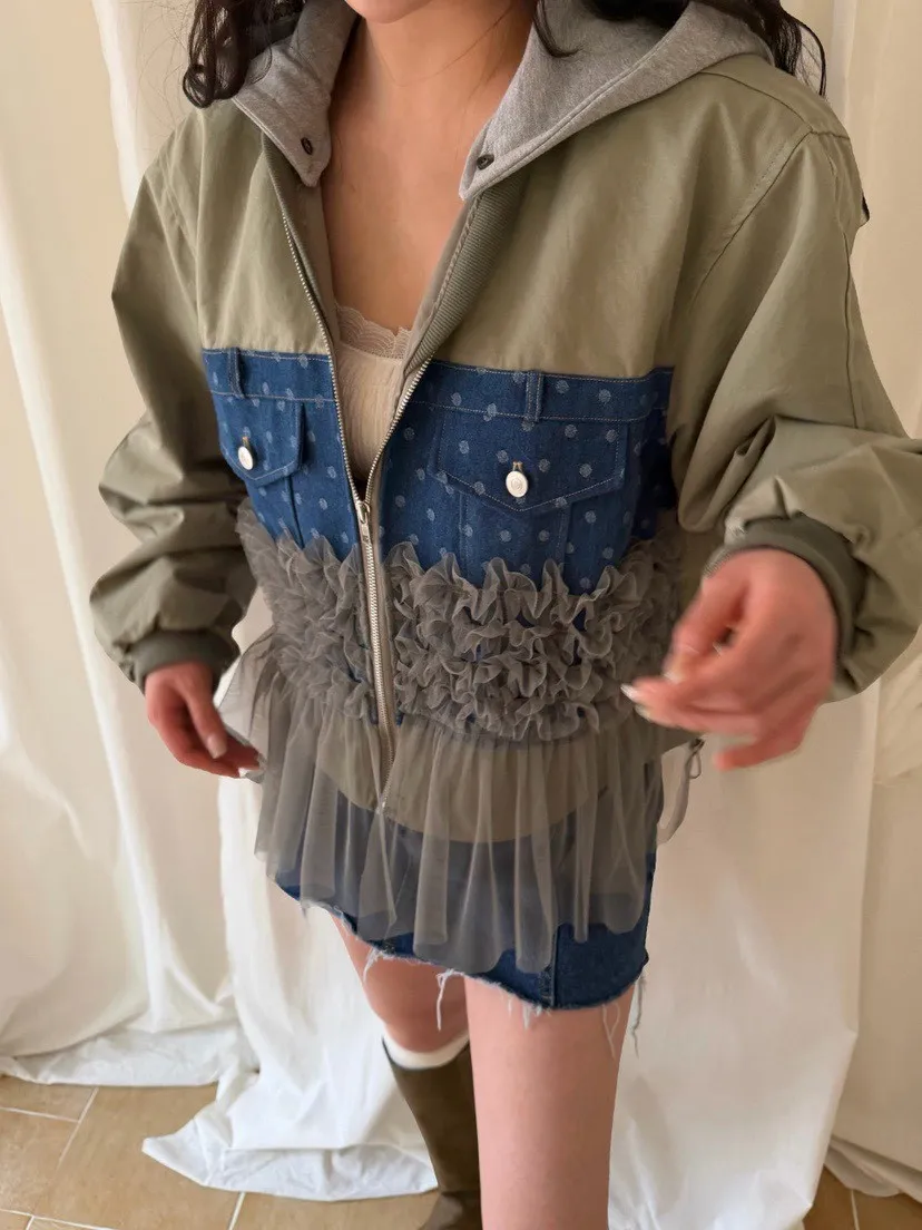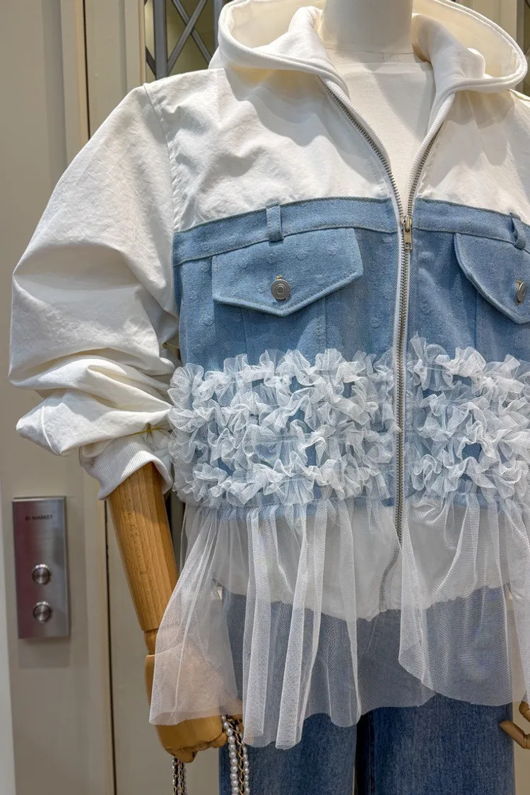 異材質拼口袋蕾絲外套