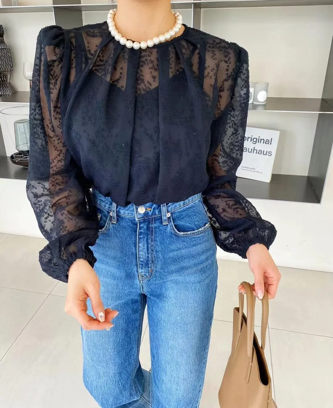 蕾絲提花透膚兩件式上衣